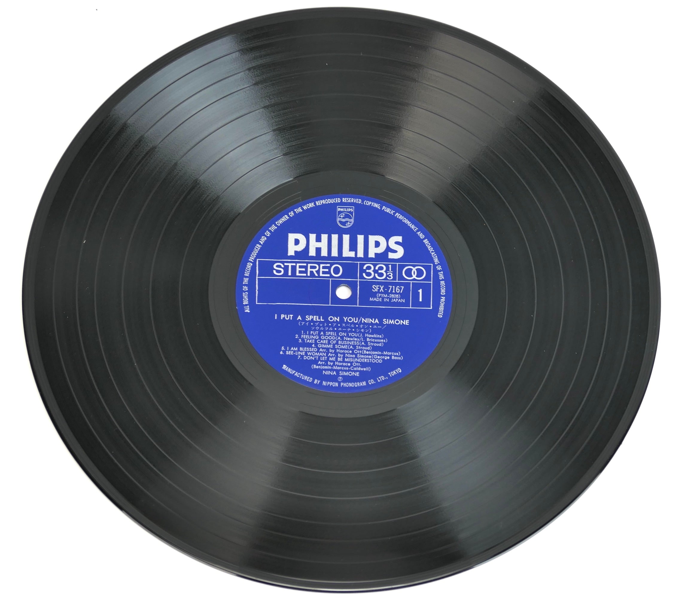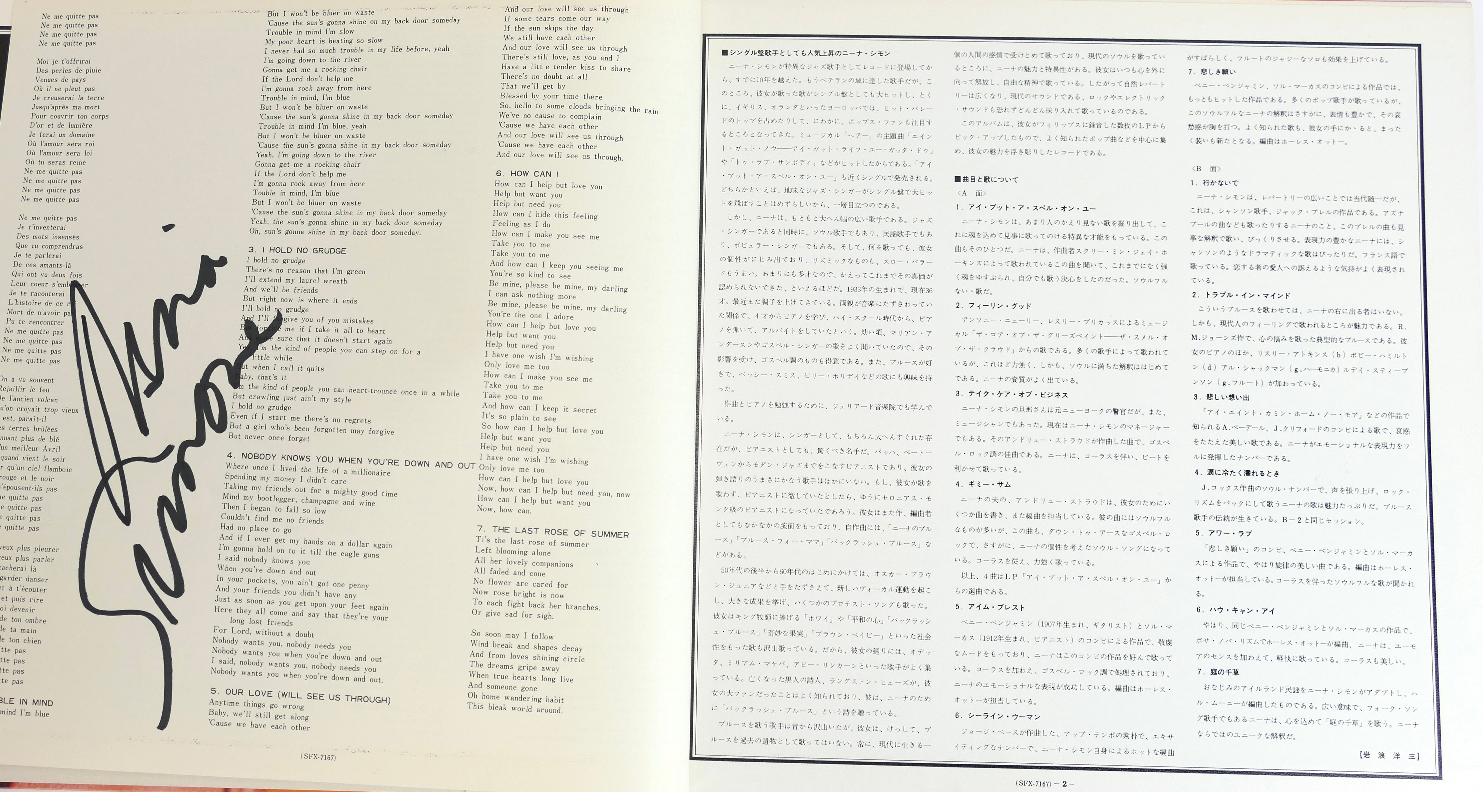 Signed LP from the American signer, songwriter, arranger and pianist, who has signed and dated 1973 boldly on the record label and again to an interior page of the album booklet of this Japanese pressing of her legendary 1965 album I Put a Spell on You. Label: PHILIPS SFX-7167; Cover, record and Obi strip all in very fine condition.