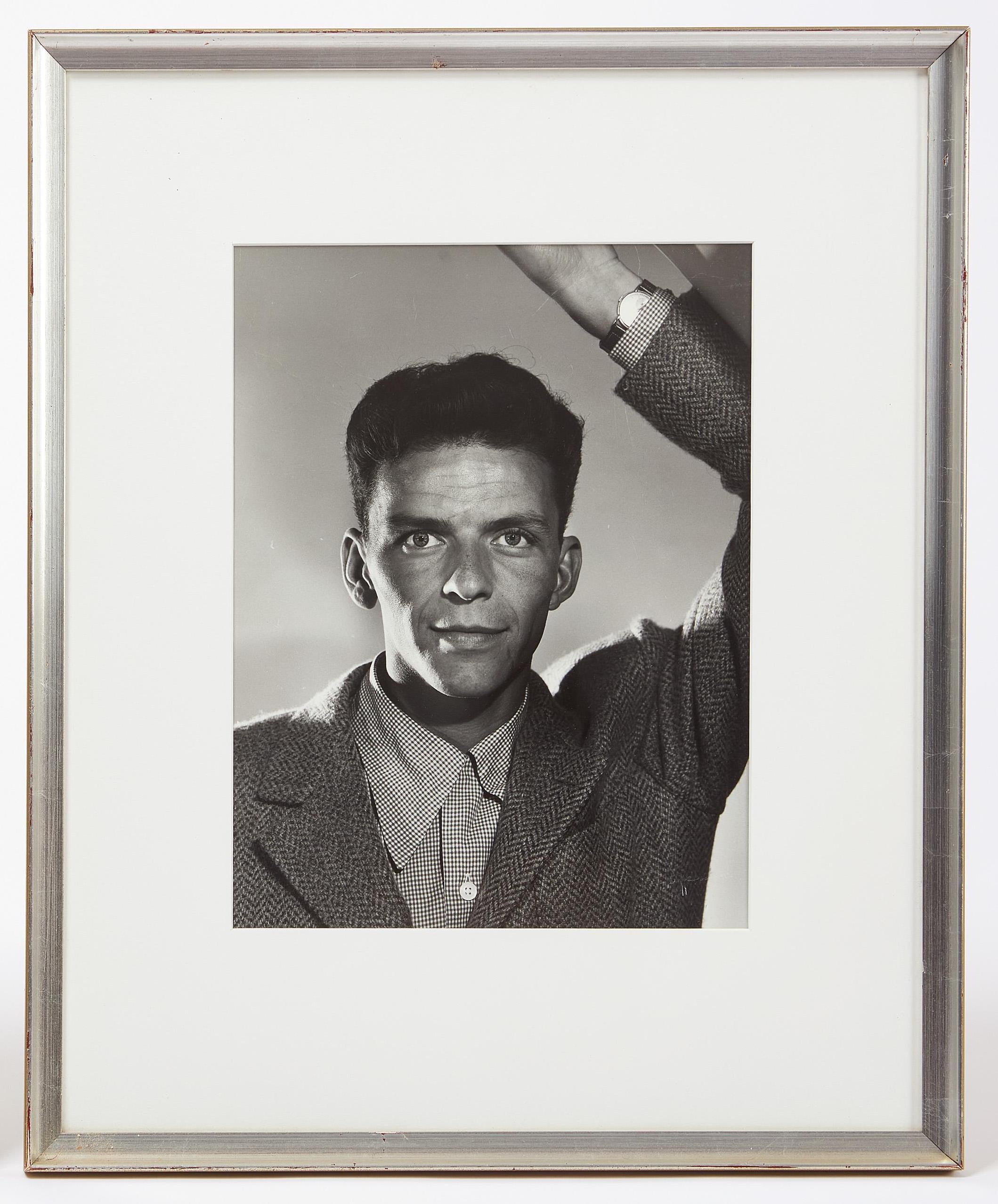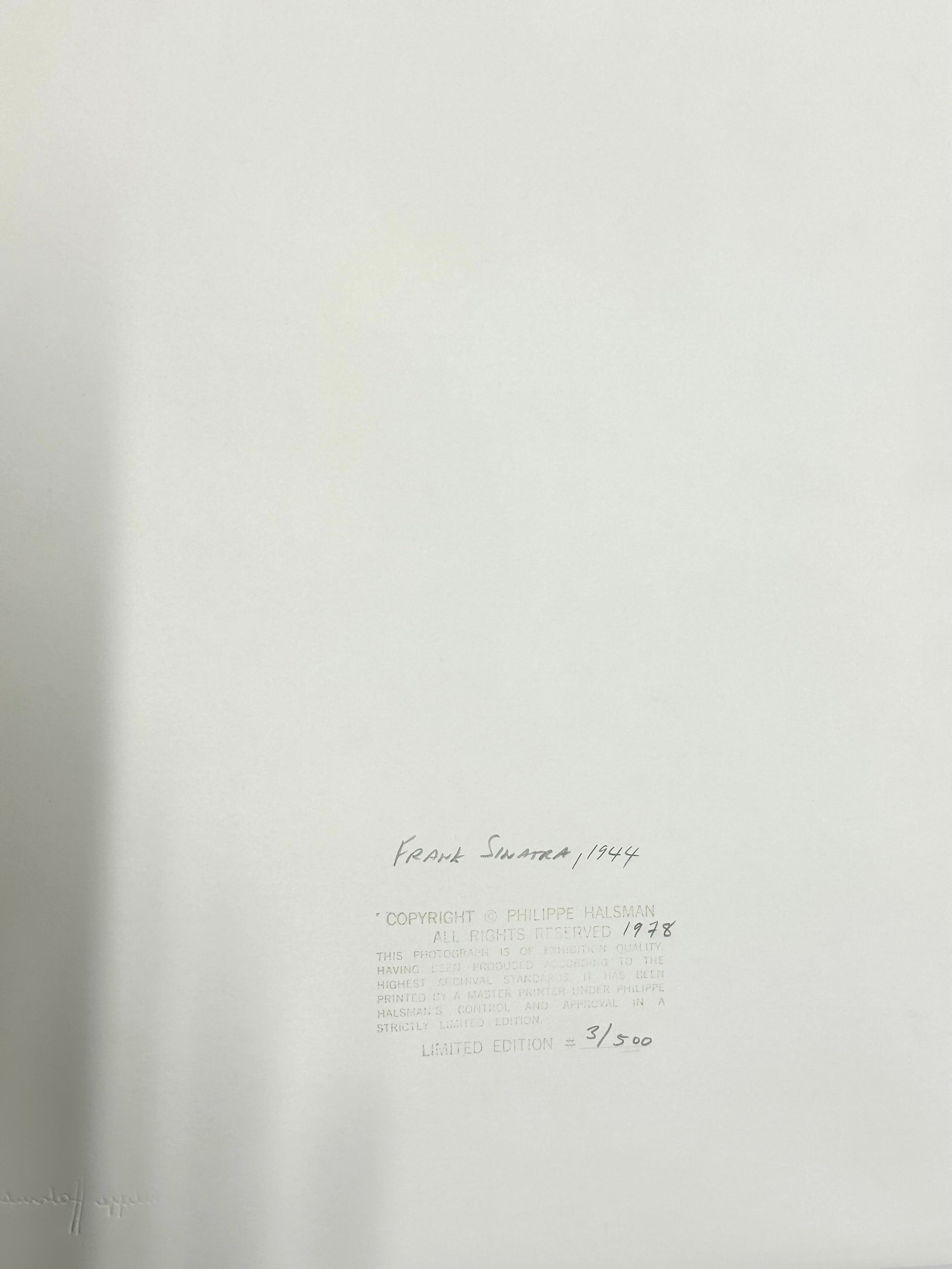 Fine original Halsman silver print photograph of a young Sinatra in 1944, printed 1978. Embossed hand stamp on lower right recto and copyright hand stamp with the title, dates, and edition notation in pencil, number 3 of 500, on verso. 14 x 11 inches matted and framed to 22 x 18 inches.