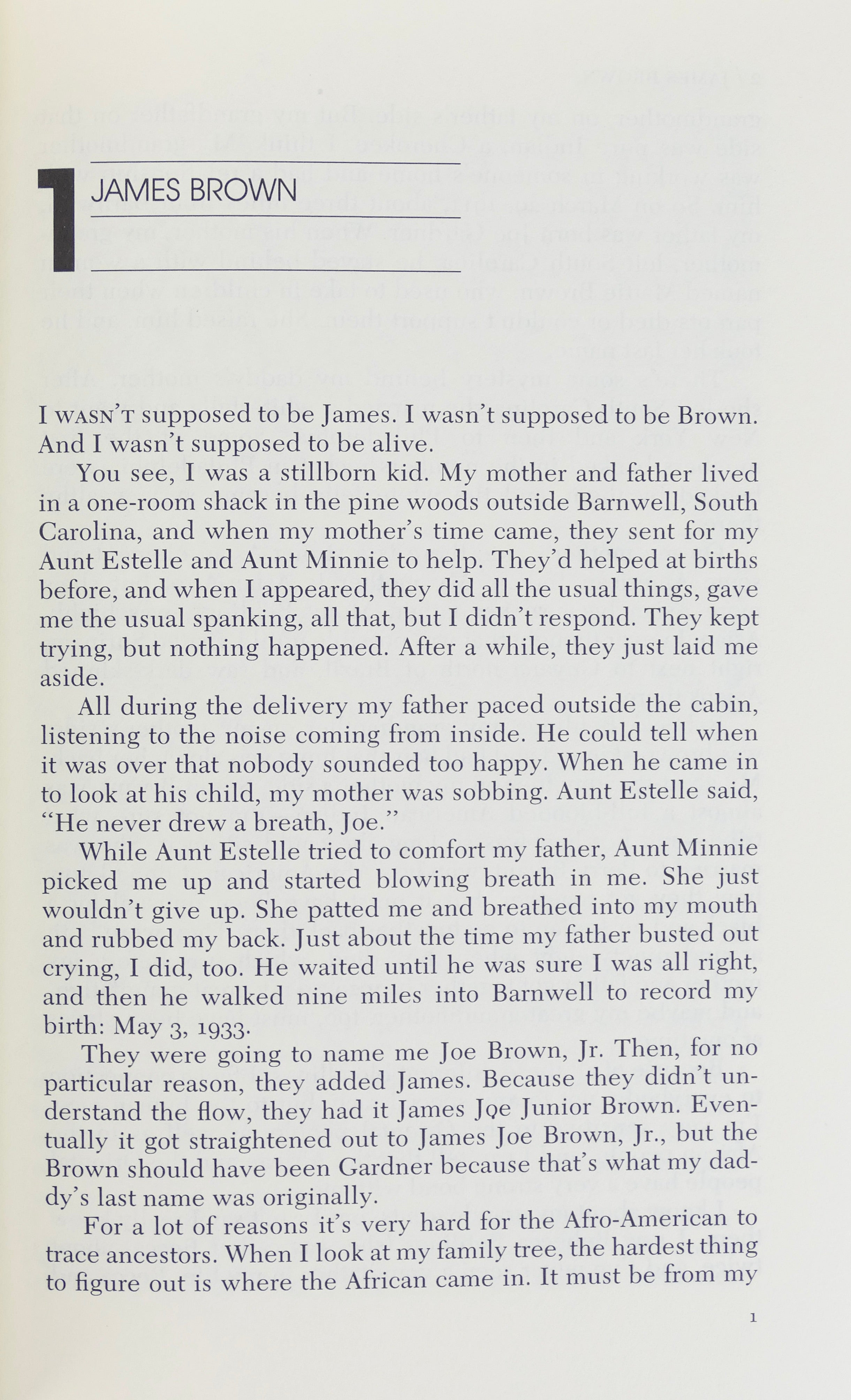 Hardcover. 8vo. 336 pp. Written with Bruce Tucker. Signed and inscribed in blue ink on the front free end paper "To bro Jim my Thanks Always / James Brown / God bless you." Includes 16 pages of black and white photographs and a full discography on pages 269-326. In very fine condition throughout, in a very fine dustjacket.