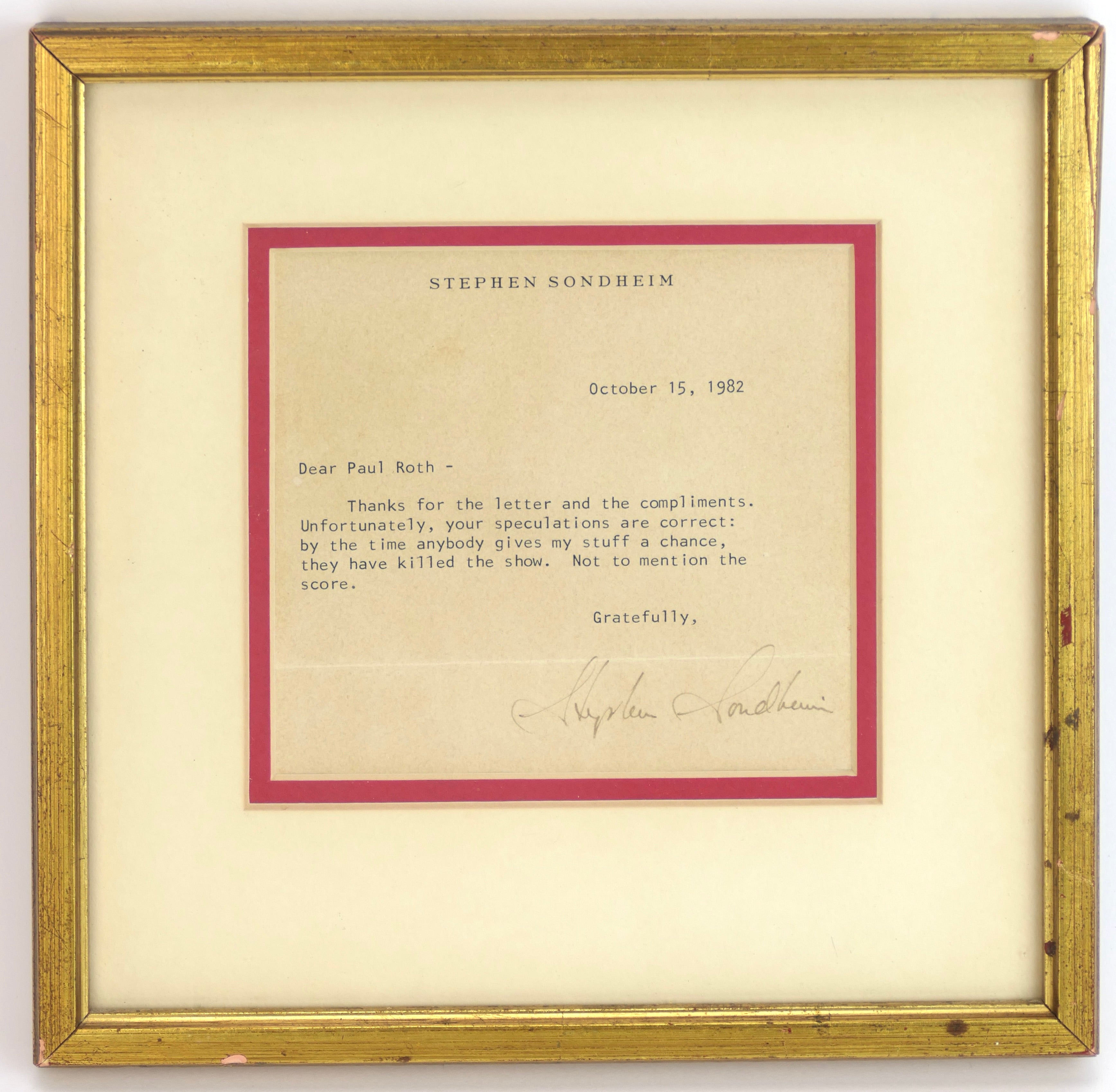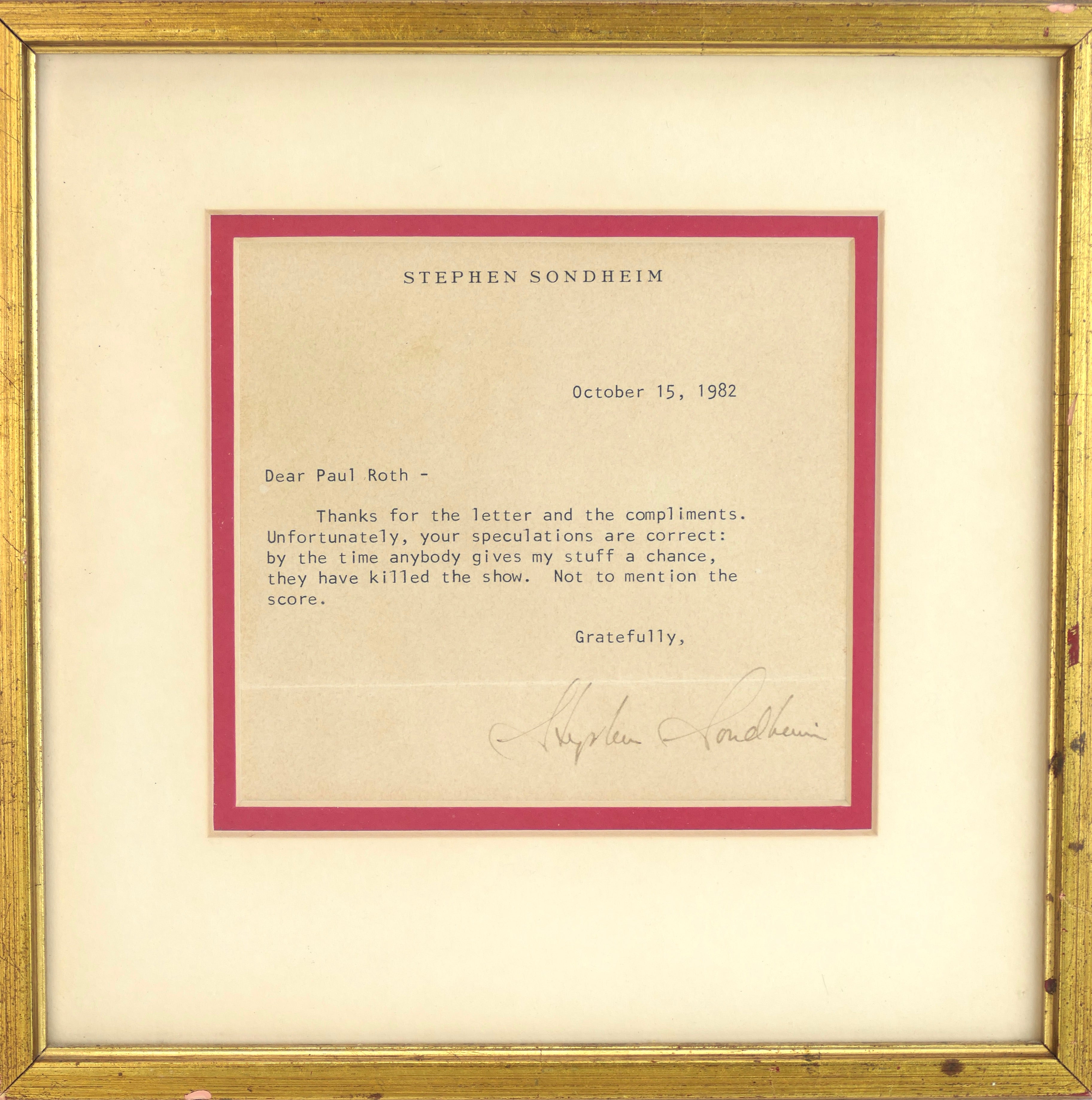 Typed letter signed from the important composer and lyricist. One page, 5 x 5 inches (visible), matted and framed to 9 x 9 inches. Personal letterhead, October 15, 1982, to Paul Roth. In full: “Thanks for your letter and the compliments. Unfortunately, your speculations are correct: by the time anybody gives my stuff a chance, they have killed the show. Not to mention the score.” Overall toning, unexamined out of frame, in apparently fine condition.