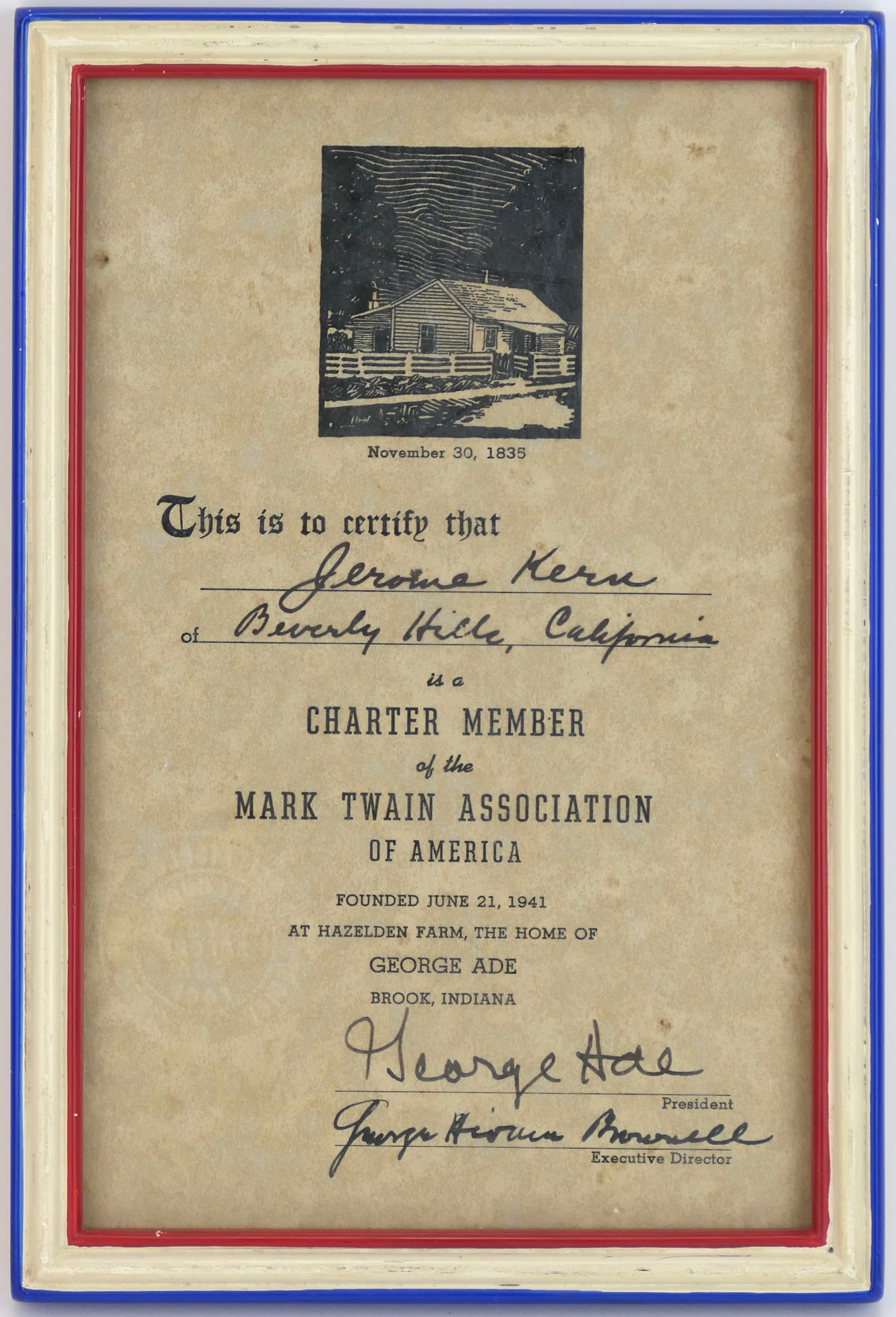 1 page, with a woodcut image at the head and printed and manuscript text reading in full: "This is to certify that Jerome Kern of Beverly Hills, California [handwritten] is a CHARTER MEMBER of the MARK TWAIN ASSOCIATION OF AMERICA Founded June 21, 1941 at Hazelden Farm, the Home of GEORGE ADE Brook, Indiana" and signed in ink "George Ade" (President) and "George Hiram Brownell" (Executive Director)" and with raised blindstamp lower left. In an attractive red, white, and blue frame measuring 6 x 9 inches (15.5 x 23 cm). In fine condition, from the collection of Jerome Kern by descent to his daughter Betty Kern Miller and by descent through her estate.