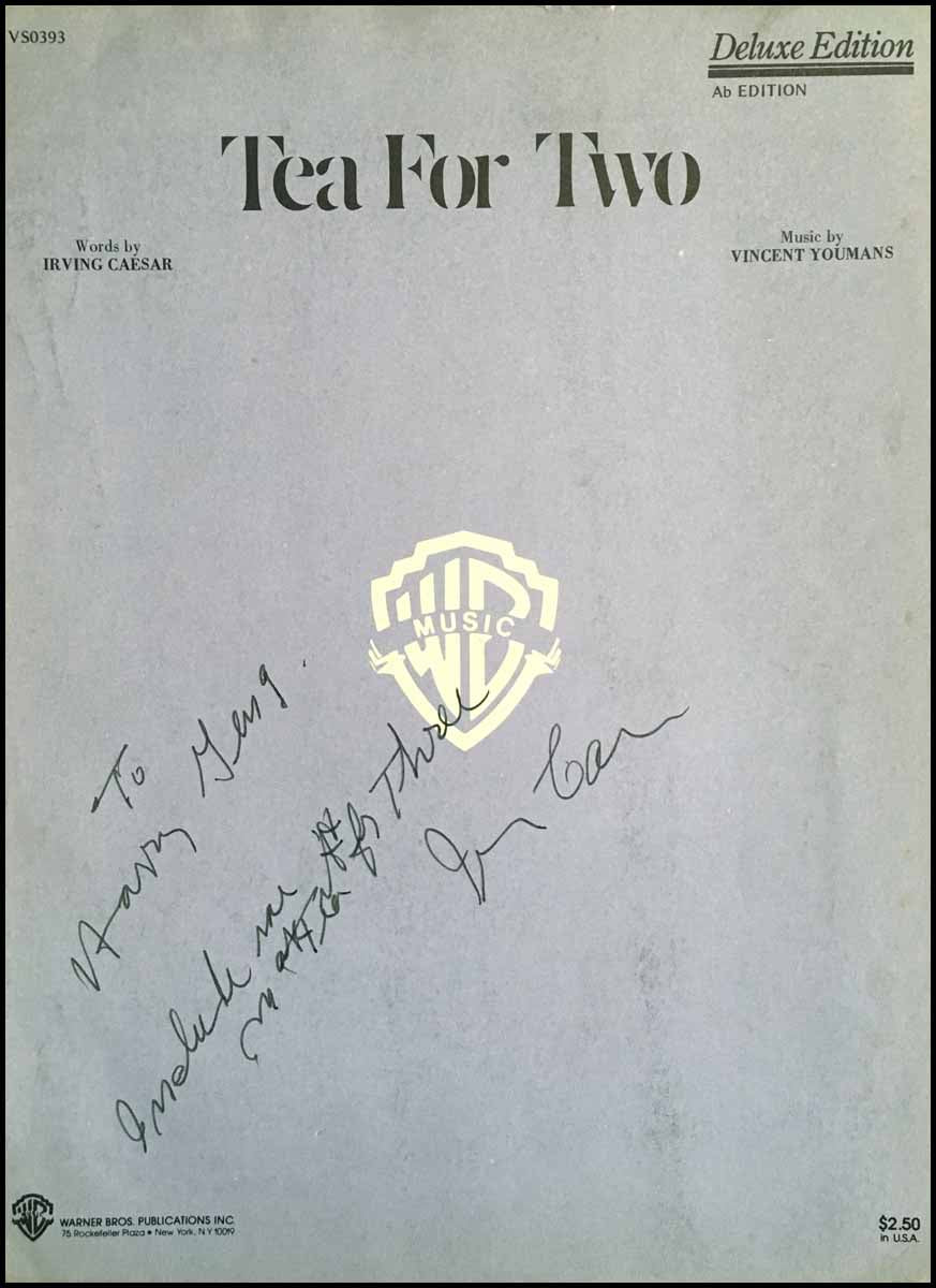 Caesar, Irving. (1895 - 1996). Tea For Two - SIGNED. New York: Warner Brothers. Sheet music, signed and inscribed on the cover "Include me and make Tea for Three / Irving Caesar." Fine.