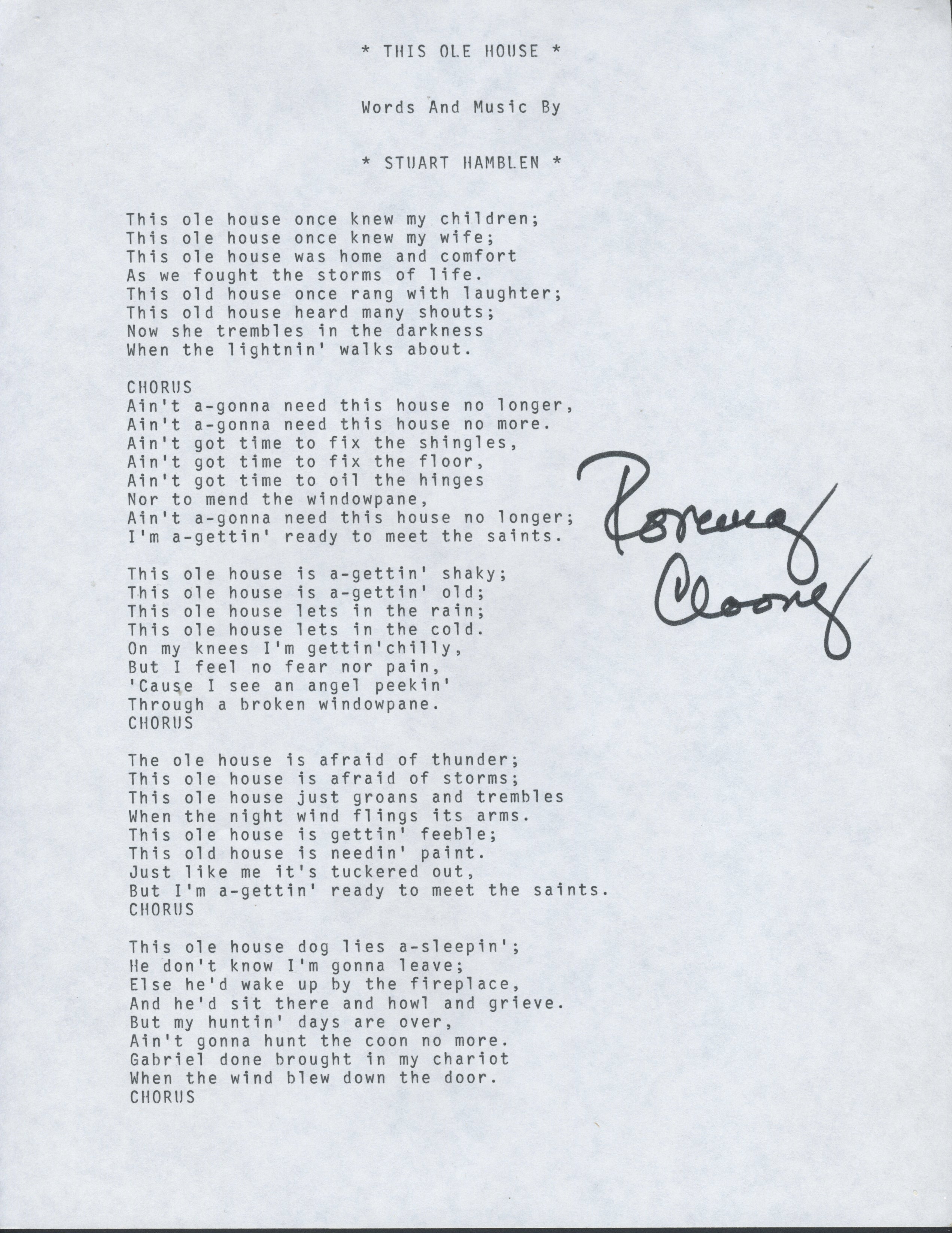 Typed lyrics to the beloved song "This Ole House" by Stuart Hamblen, boldly signed at the right by singer Rosemary Clooney, who recorded it in 1954. Very fine. 8.5 x 11 inches (21.7 x 28 cm).