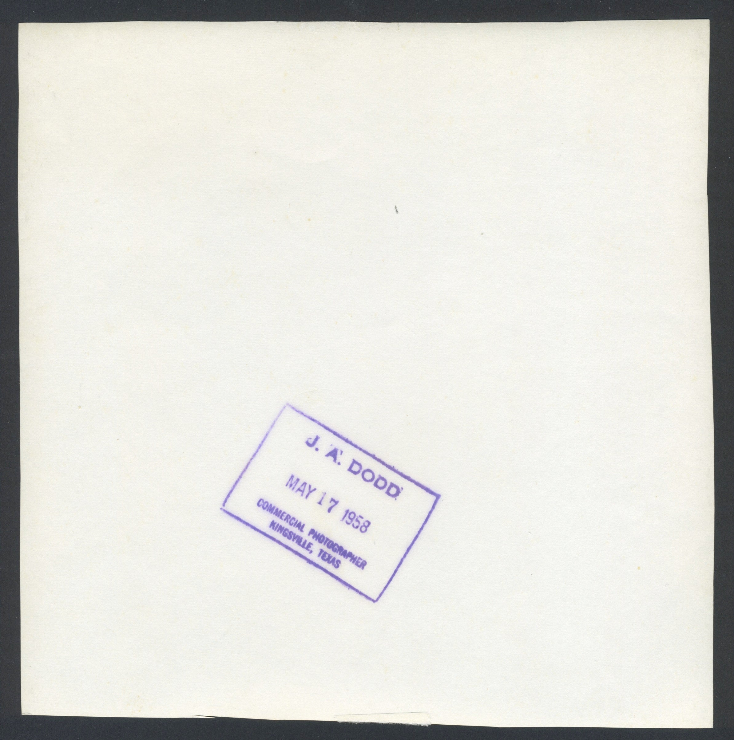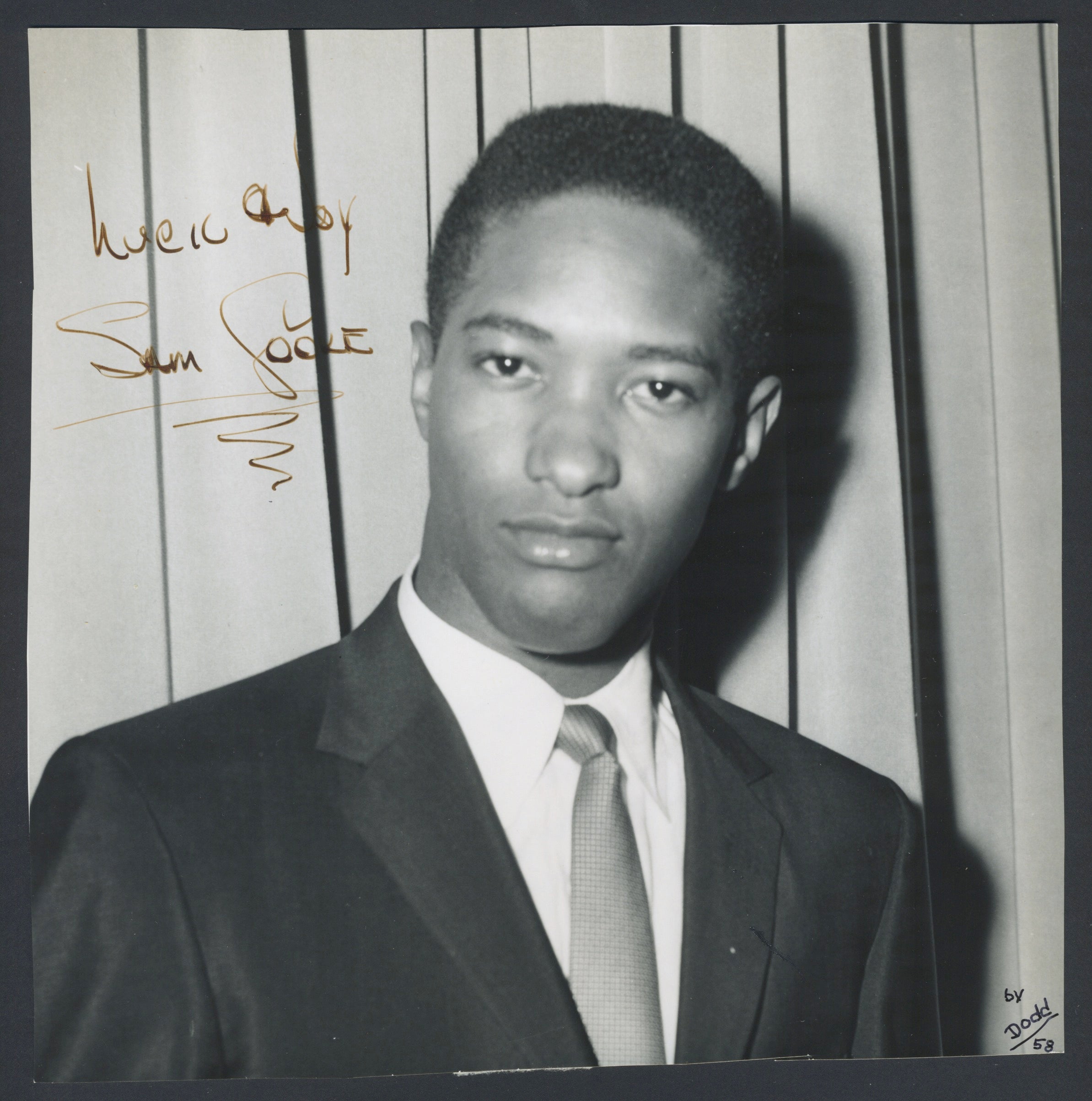 Rare signed photograph of the popular soul singer, photographed by J. A. Dodd. Cooke has signed and inscribed boldly at the left. Photographer's signature at the lower right and stamp to the verso, dated May 17, 1958. One small scratch; slightly irregularly trimmed; overall fine. 7.5 x 7.5 inches (19 x 19 cm).