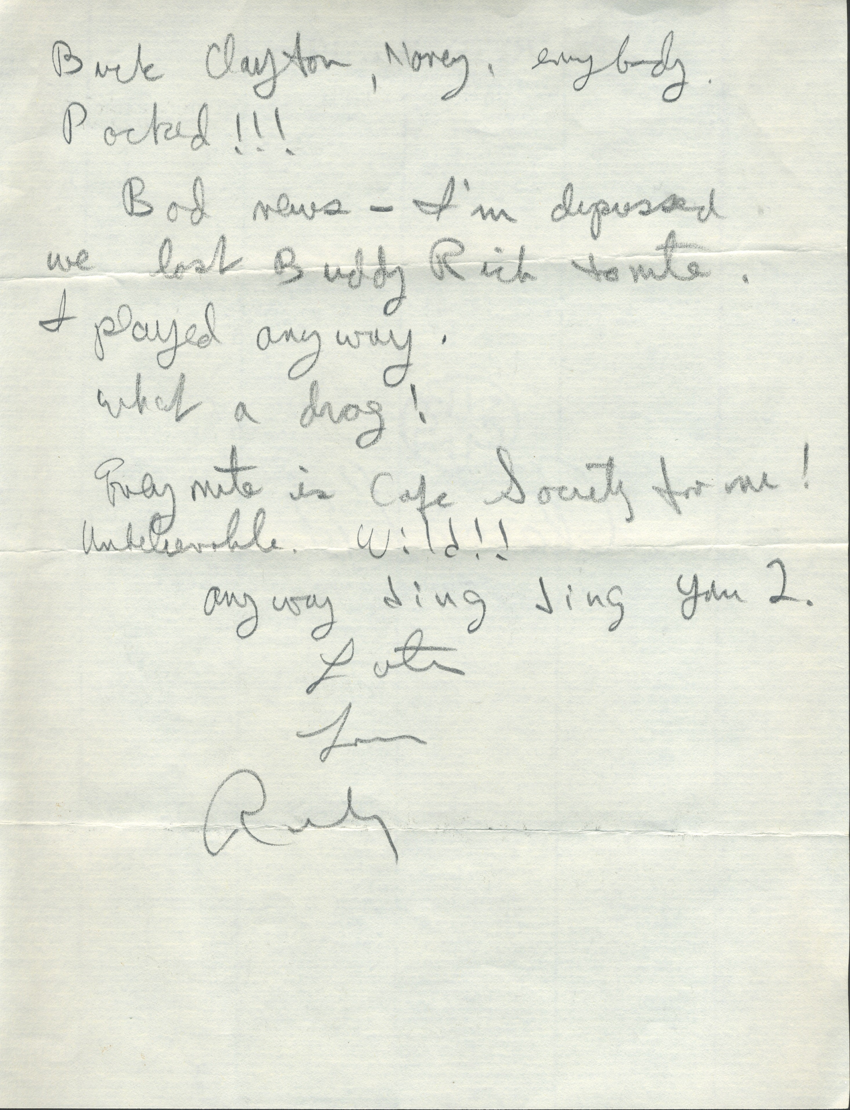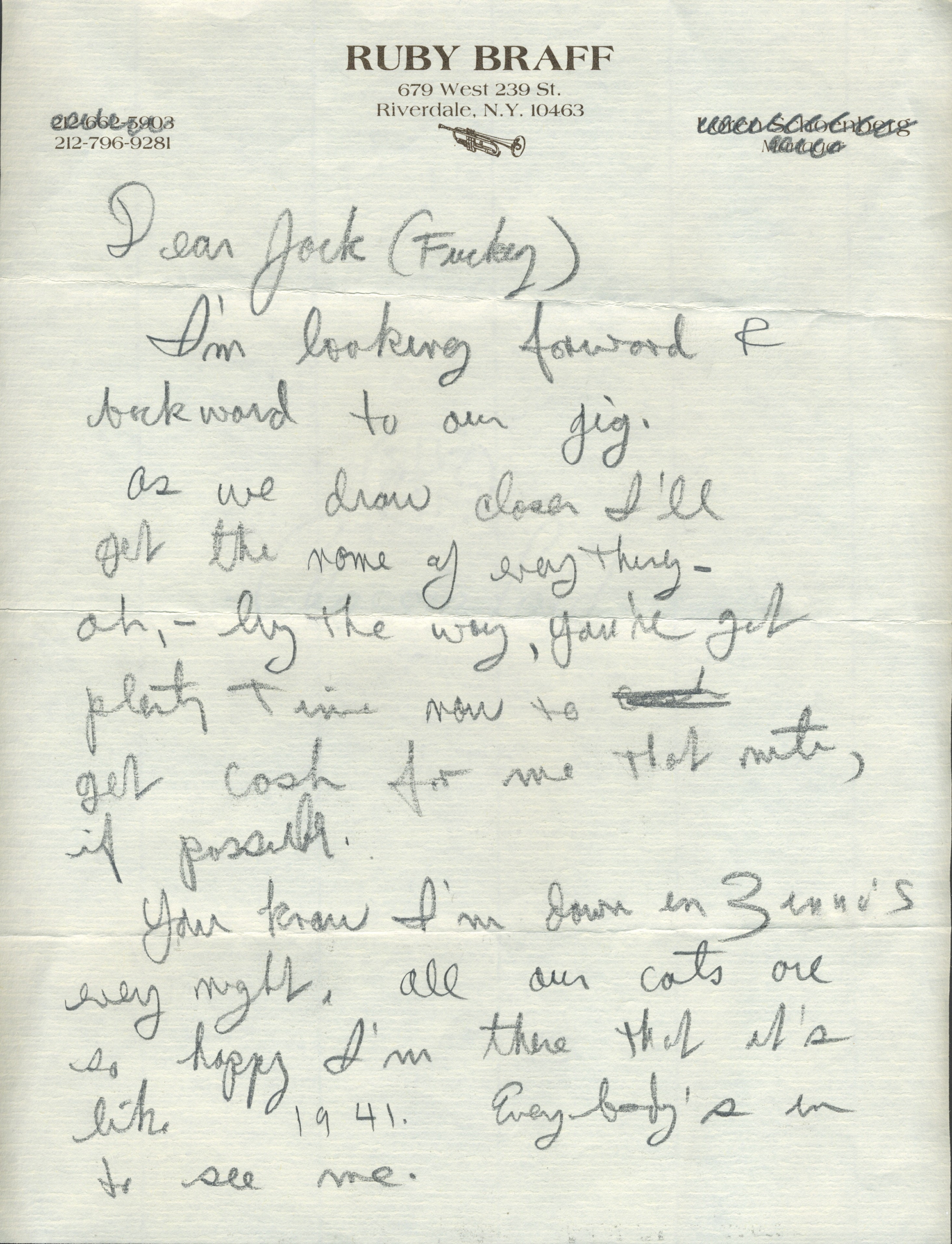 Autograph letter from the American jazz trumpeter Reuben "Ruby" Braff to Jack Bradley, the jazz photographer, manager and writer, and close friend of Louis Armstrong. 2 pp., [n.d.], with envelope postmarked April 4, 1987. Braff writes: "Dear Jack (Fuckey), I'm looking forward & backward to our gig. As we draw closer I'll get the name of everything—oh, by the way, you've got plenty time now to get cash for me that nite, if possible. You know I'm down in Zinno's every nite, all our cats are so happy I'm there that it's like 1941. Everybody's in to see me. Buck Clayton, Morey, everybody. Packed!!! Bad news—I'm depressed we lost Buddy Rich tonite. I played anyway. What a drag! Every nite is Cafe Society for me! Unbelievable. Wild!! Anyway sing sing you 2. [...] Ruby." Written in pencil on Braff's letterhead. Folding creases, some light smudging, overall fine with original envelope. 8.5 x 11 inches (21.5 x 28 cm).