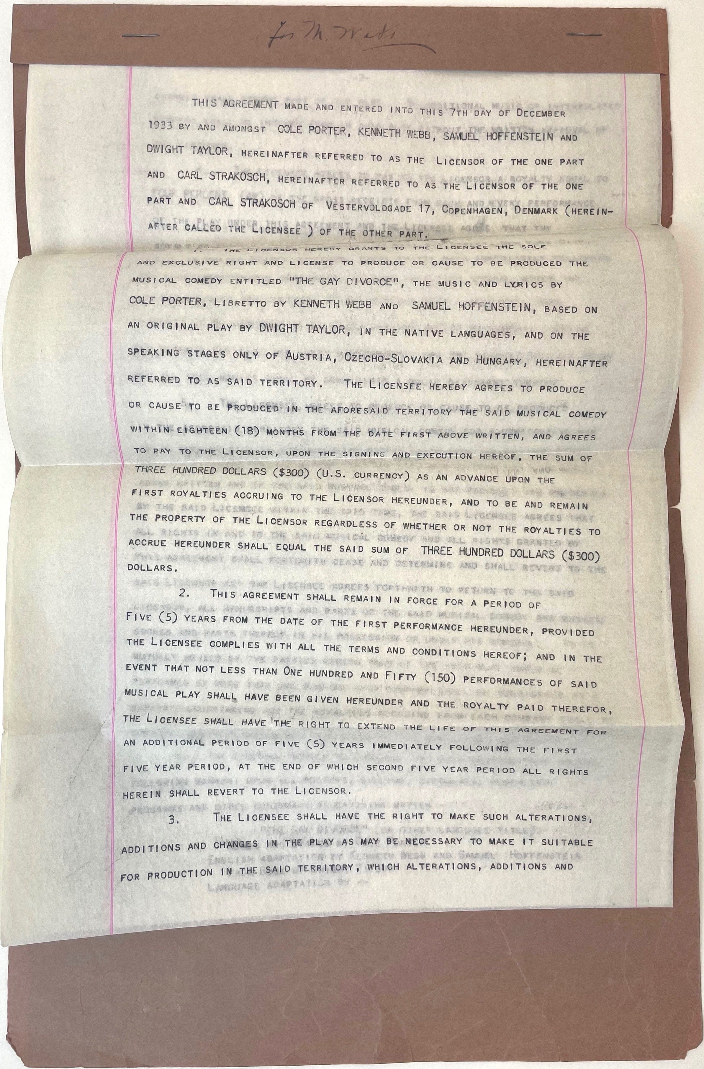 Original 1933 contract, 4 pp, 8.5 x 11, licensing the exclusive production rights for the 1932 hit musical, Fred Astaire's last Broadway show, which featured the hit song "Night and Day" in which Astaire danced with co-star Claire Luce. It was made into a musical film by RKO Radio Pictures in 1934, starring Fred Astaire and Ginger Rogers, and renamed The Gay Divorcee. Inscribed in ink at the head of brown integral folding wrappers from Richard J. Madden Play Company (No. 33 West 42nd St, New York City), "For M. Wats" and at the conclusion, "True Copy / R. J. Madden" beside the printed list of signatories (none of whom have signed this copy): Carl Strakosch, Samuel Hoffenstein, Dwight Taylor, Kenneth Webb, and Cole Porter.
