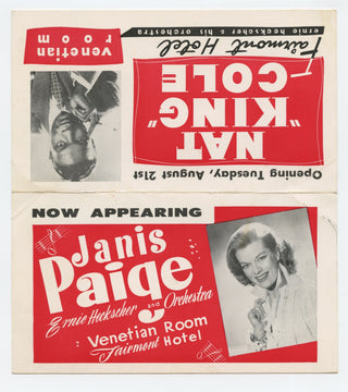 Cole, Nat King. (1919–1965) & Singer, Hal. (1919–2020) & Paige, Janis. (b. 1922) Ticket from 1949 Roanoke concert and advertisement from the Fairmount Hotel, San Francisco