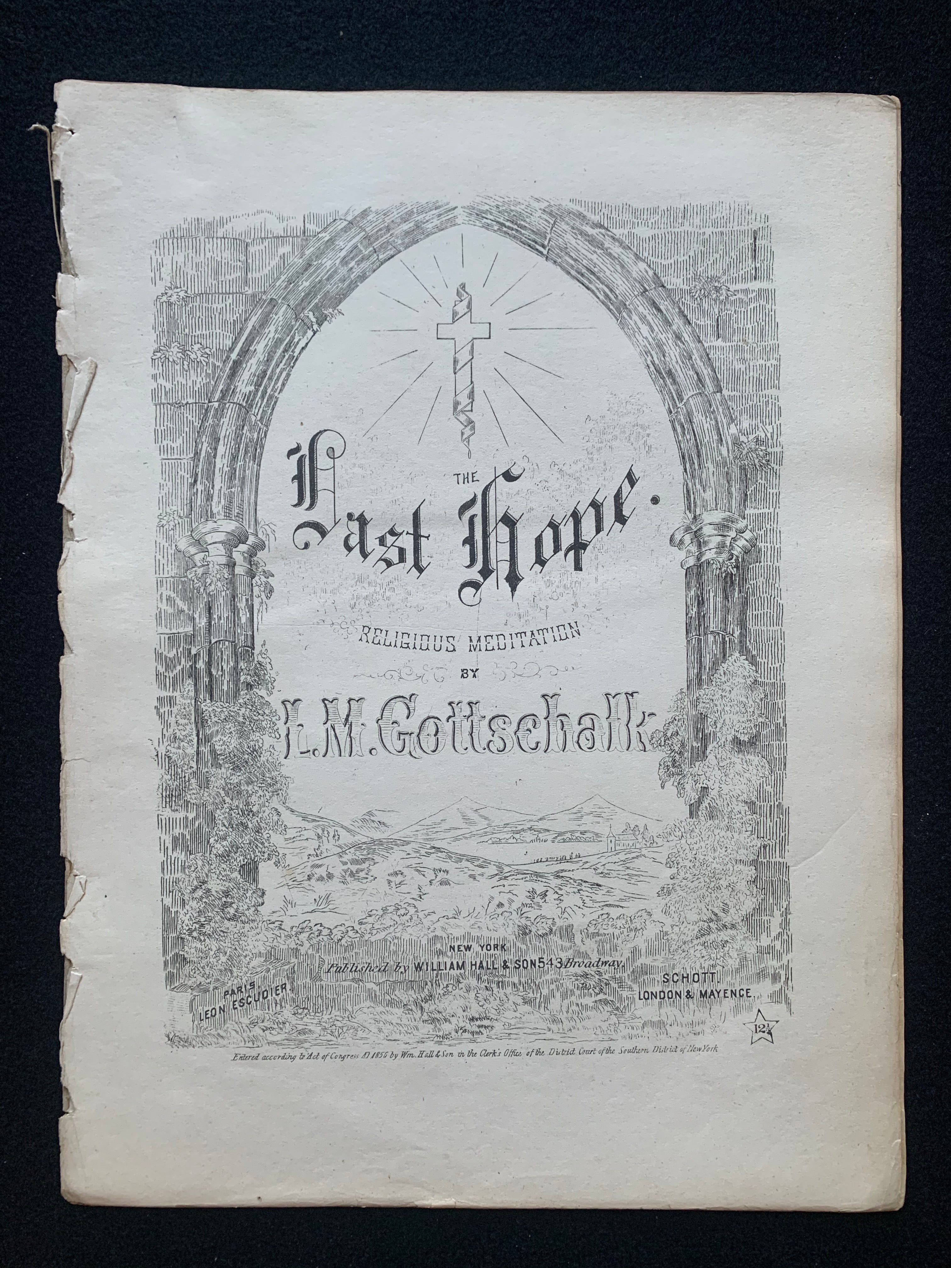 "The Last Hope: Religious Meditation." Upright folio. New York: William Hall & Son. 12 pp. Lithograph. [PN] 3515. Priced at 12.5¢. Disbound from larger volume. Wear to left edge, cover page separated, else fine. 9.75 x 13.25 inches (24.8 x 33.6 cm.).