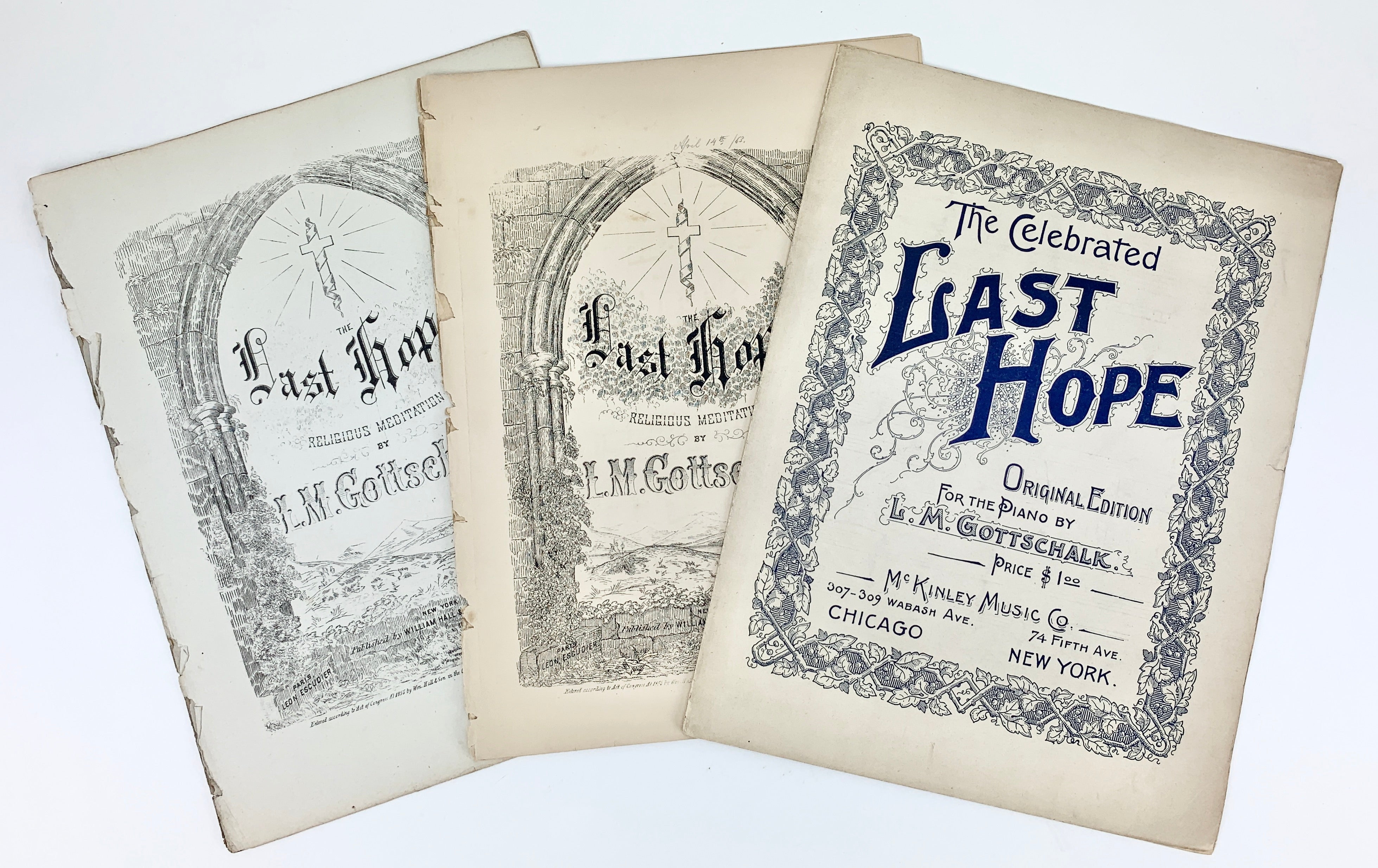 Three early editions of the composer's "The Last Hope." Two editions share plate numbers, but are slightly different in their layout and have different price indications.
