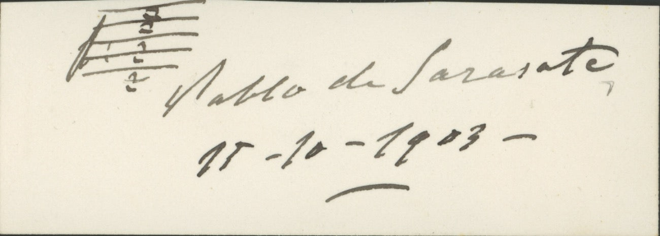 AMQS from the important Basque violinist, who has penned a single chord and dated "15-10-1903." Mounting remnants to verso, slight irregular trim, else in very fine condition. 3.5 x 1.25 inches (8.9 x 3.2 cm.).