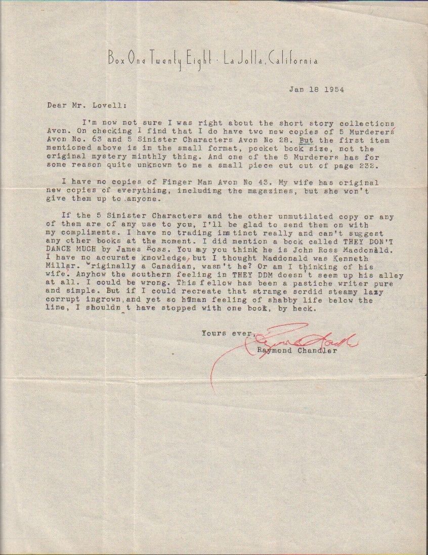 Chandler, Raymond. (1888-1959). Typed Letter Signed, Discussing Detective Fiction. TLS from the British-American novelist and screenwriter known for his influential hard-boiled detective fiction, including The Big Sleep and Farewell, My Lovely. 1 page. Dated January 18, 1954. Three paragraphs in which he discusses copies of books he has that may be of interest to the recipient, presumably a collector, and his own interest in a book called They Don't Dance Much by James Ross. Several sentences discount the idea that James Ross is John Ross Macdonald, and Chandler closes: "But if I could recreate that strange sordid steamy lazy corrupt ingrown, and yet so human feeling of shabby life below the line, I shouldn't have stopped with one book, by heck." He signs, "Yours ever, Raymond Chandler." Folded vertically and horizontally for mailing; otherwise in fine condition. With three tiny holograph corrections.