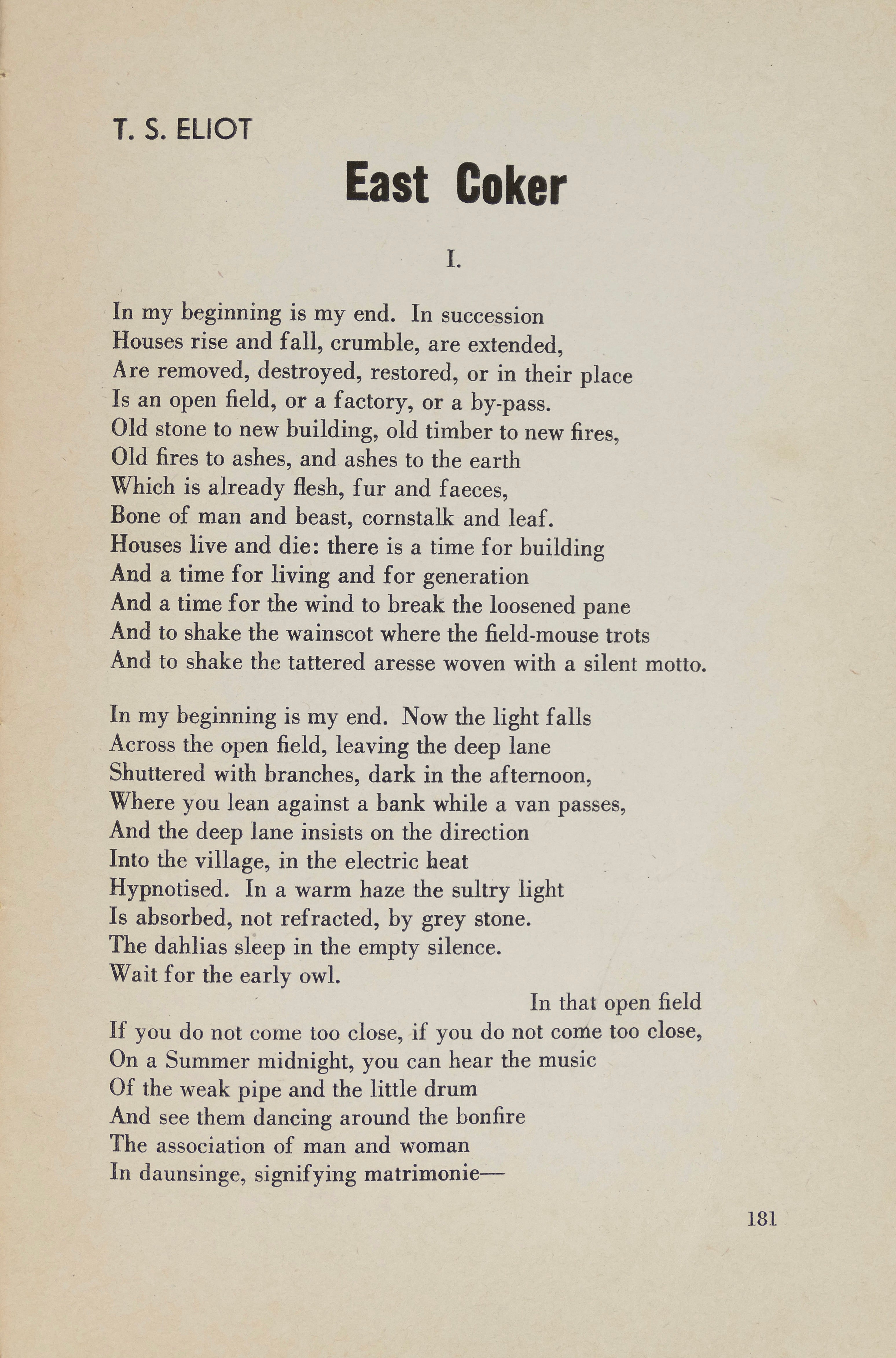 Softcover. 170-248 pp. Printed wrappers, scattered staining and toning to covers, block separated inside from wrappers, otherwise internally fine. Contains "East Coker. A Long Poem," by T.S. Eliot; "A Goat for Azazel" (a short story) by Katherine Anne Porter; correspondence by William Carlos Williams and Andre Gide; and more. A rare issue with the second appearance of East Coker following its appearance in The New English Weekly Easter Number 1940, and preceding the Faber & Faber edition.