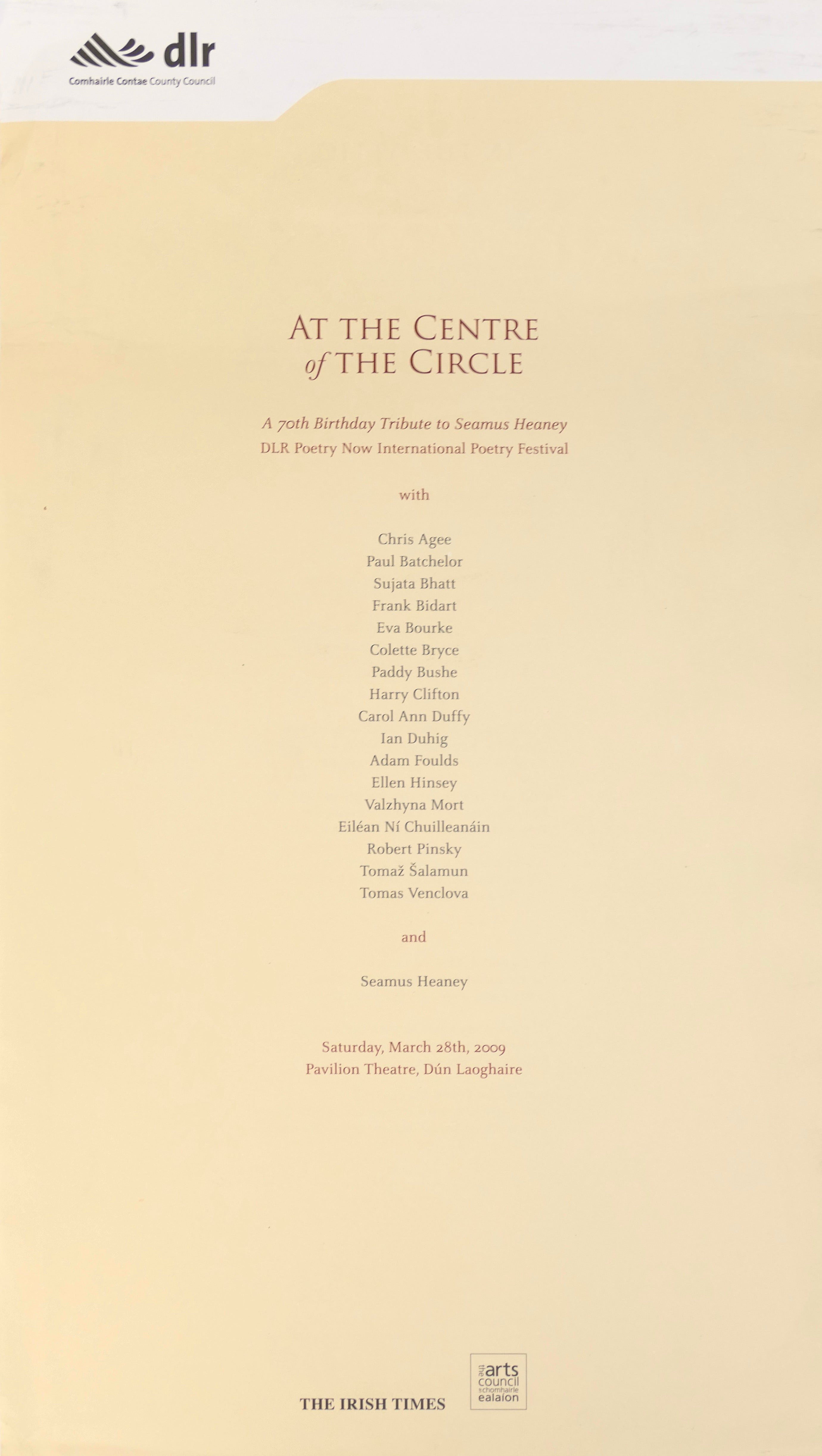 In the Attic. DLR Poetry Now International Poetry Festival, 2009. ONE OF 375 COPIES signed by the author, printed in black and brown on tan paper. Printed to accompany the event ‘At the Centre of the Circle: A 70th Birthday Tribute to Seamus Heaney’. [2] pp, 16.5 x 9.5 inches (42 x 24 cm) approx. Some light creases and wear to corners and edges, overall fine.