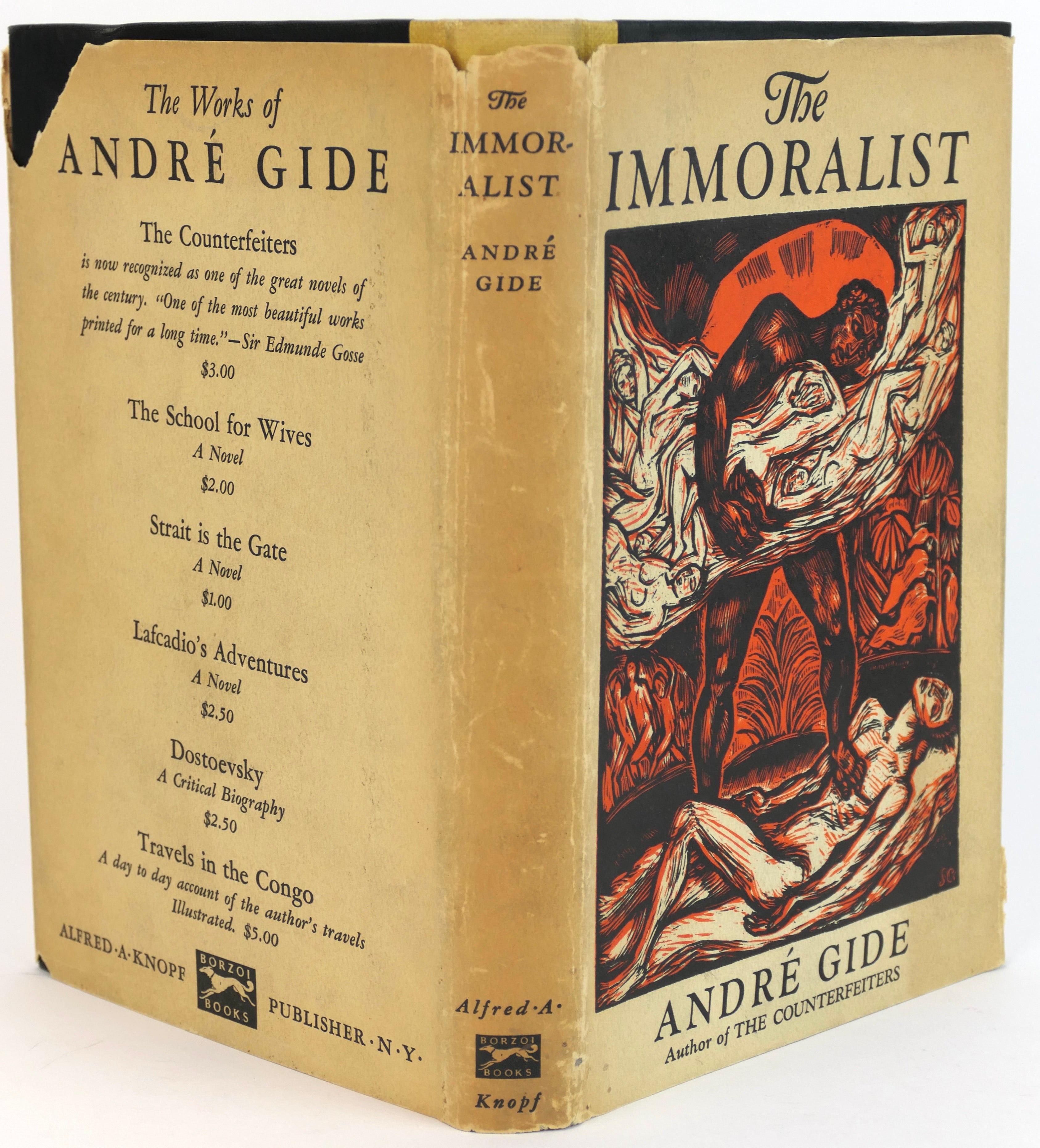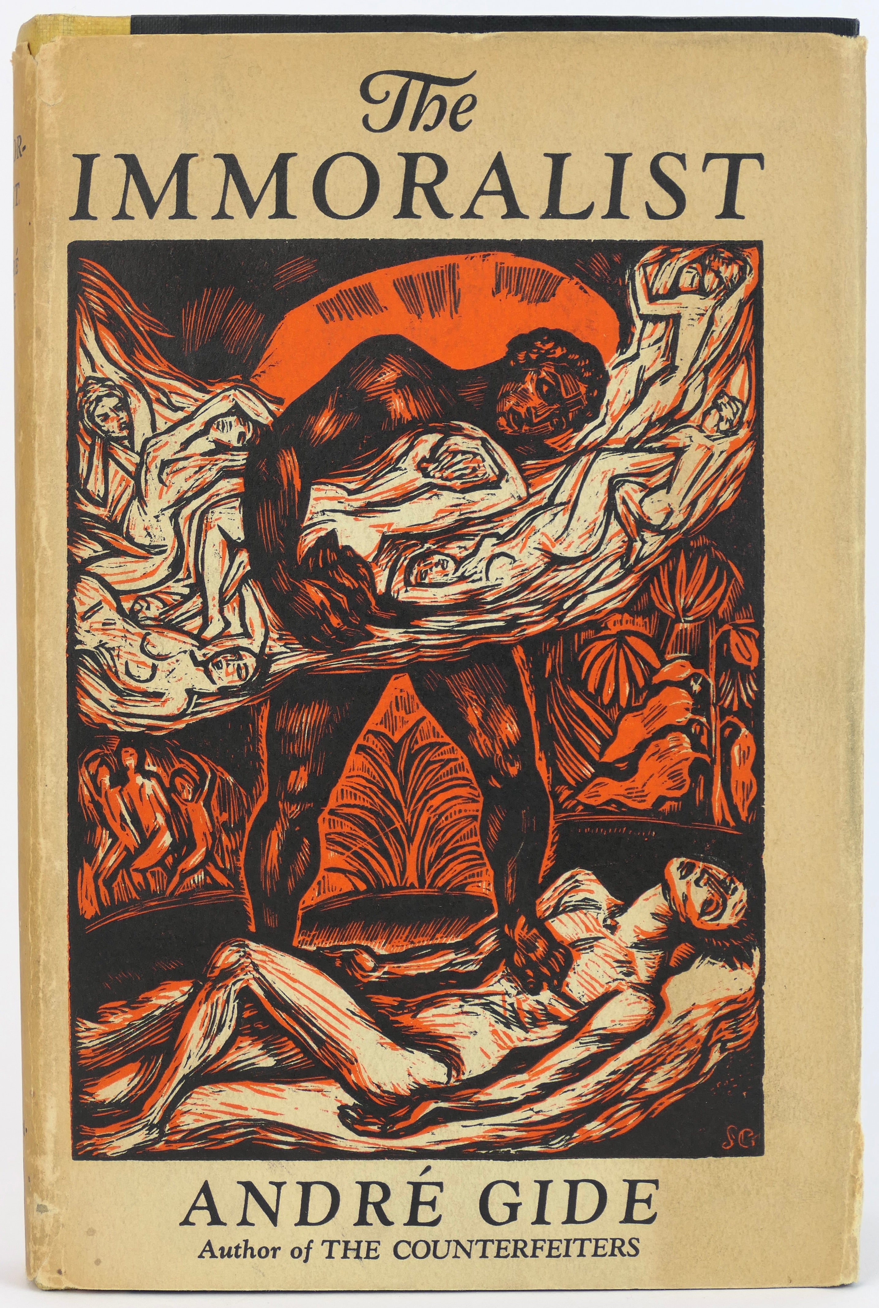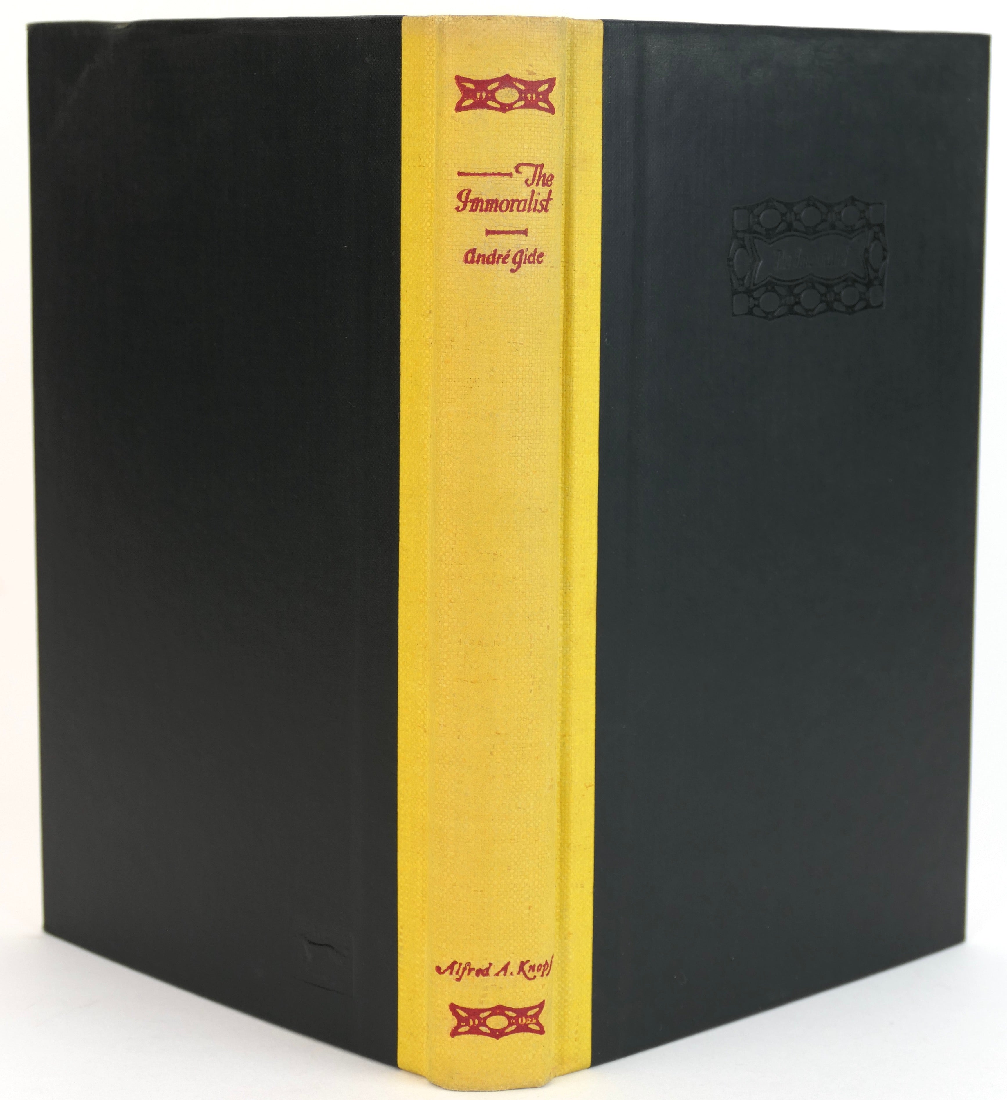 Hardcover. 8vo. 215 pp. Black boards with quarter yellow cloth, red lettering to spine. Dj in with two tears to back, price-clipped, otherwise very good. A sharp copy of the 1930 1st American edition of the Nobel prize winner's best-known work, translated from its original French by Dorothy Bussy. Gide's masterwork, including his narrator's disaffections with conventional society and strong themes of homosexual desire.