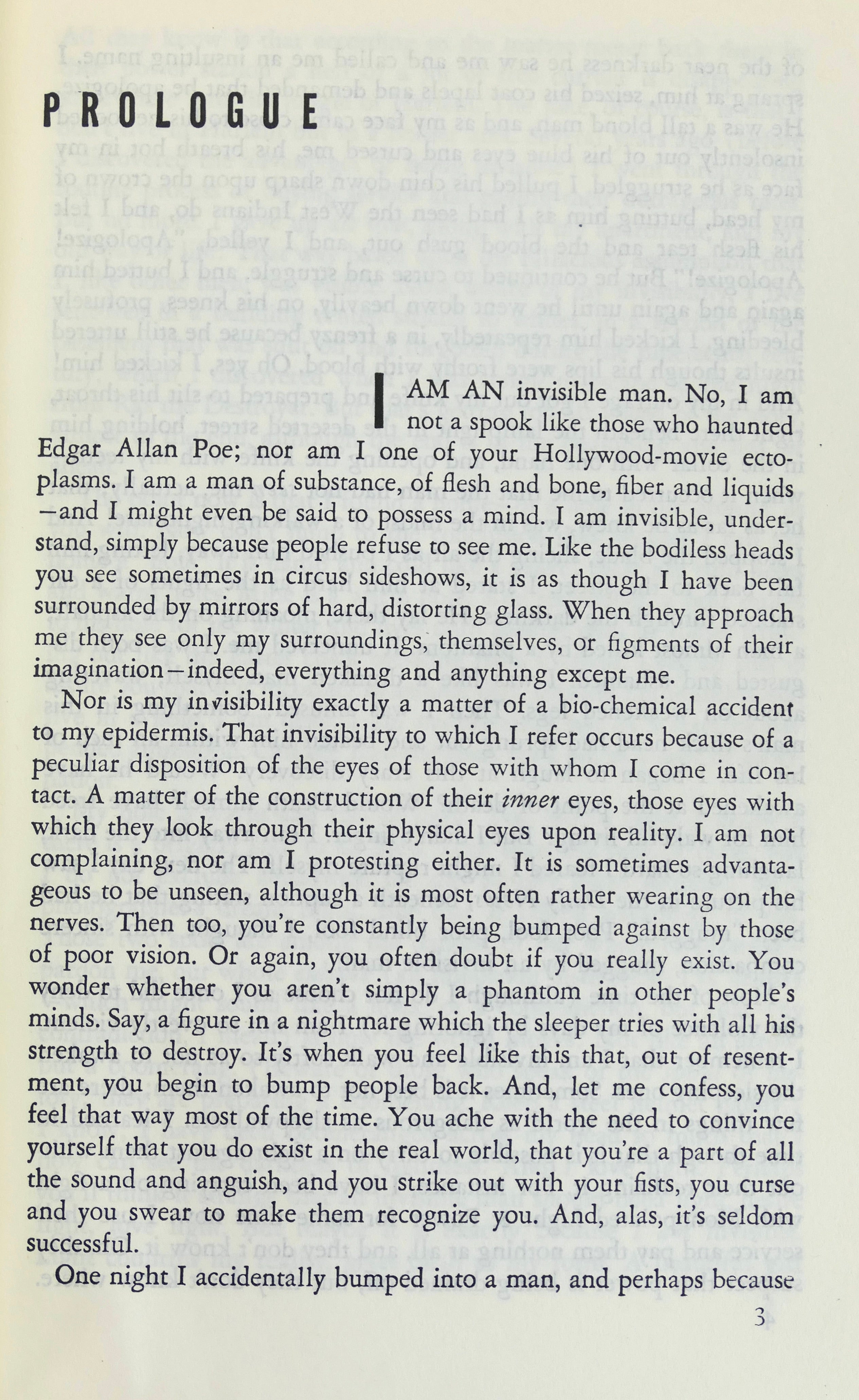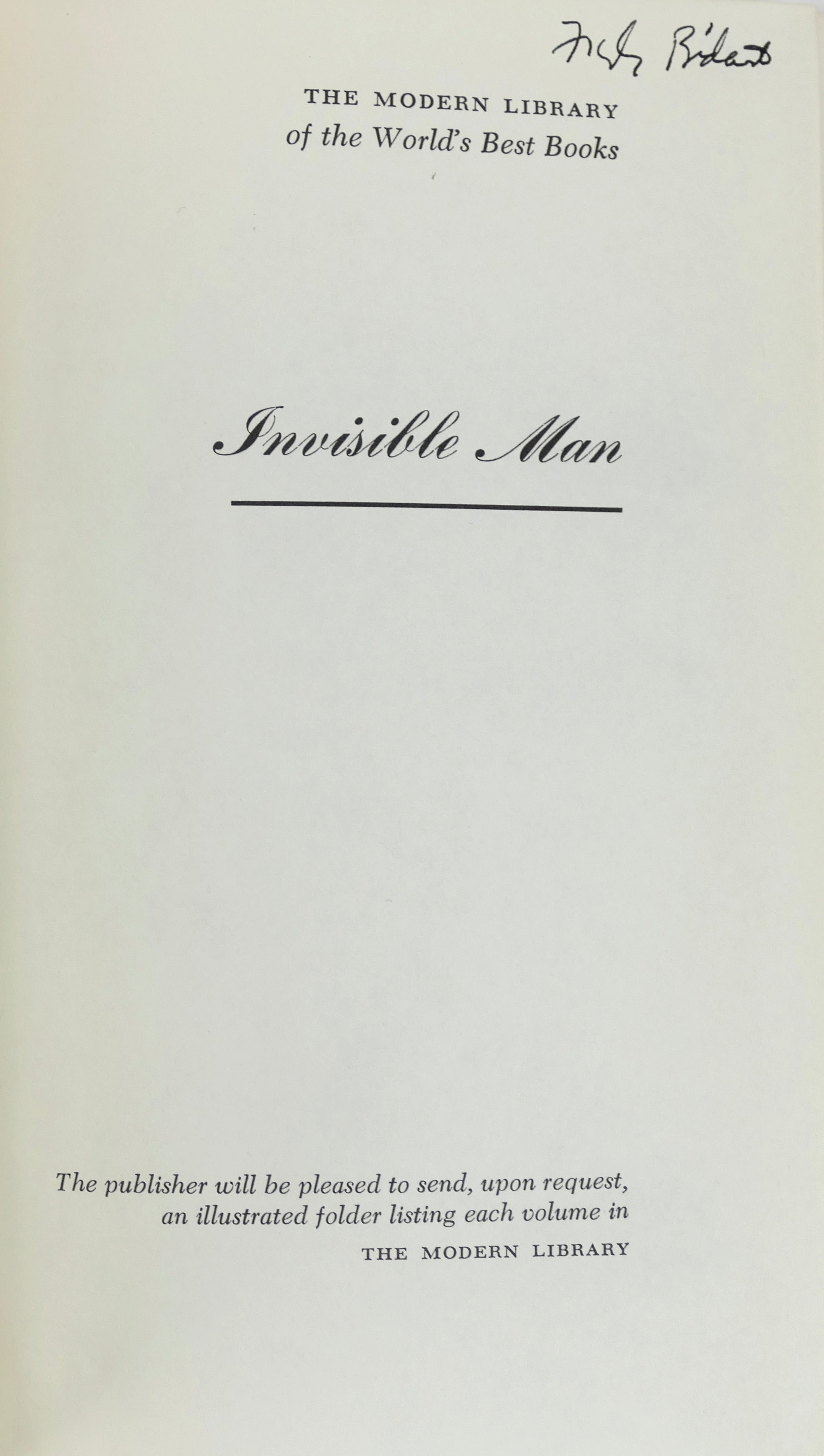 Hardcover in blue linen cloth with spine stamped in silver. Modern Library No. 338. Endpapers with the ML design, 439 pp. Fine, fresh copy in worn and somewhat moisture-stained dust jacket with $2.45 price. The last printed opyright date is 1952 but this edition is the 1965 printing (the earlier ML edition had a price of $1.95) and the publisher's address on the rear jacket panel bears a zip code. Overall a very good copu of this important book by the first African-American author to win the National Book Award (1953). His first book, Invisible Man tells of young black man search for his own identity and place in society.