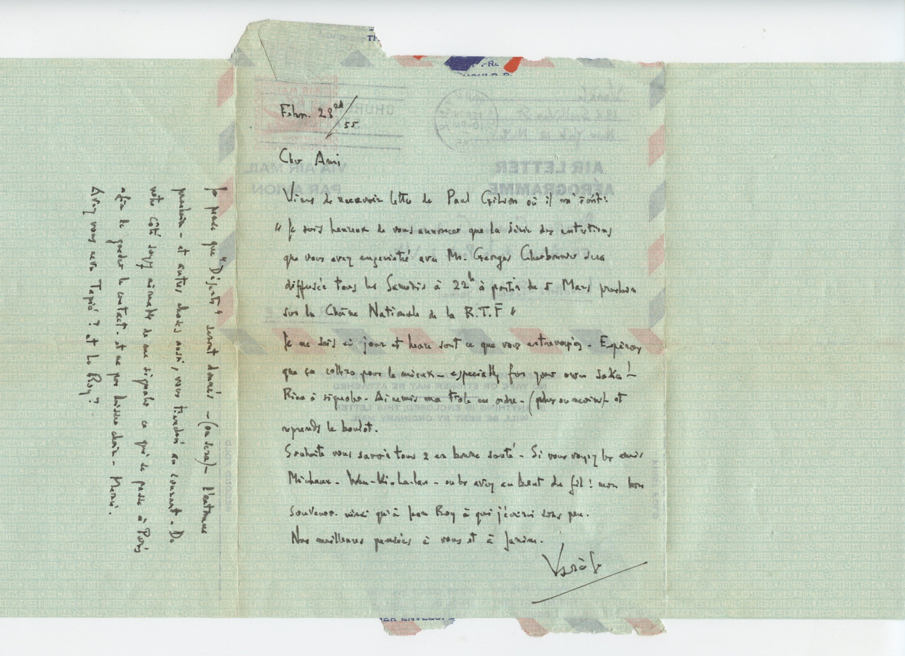 February 23, 1955. Aerogram. Varèse has learned that Charbonnier's interviews with him will be broadcast on the national channel of R.T.F. every Saturday at 10 pm beginning March 5. He comments, "Let us hope that it will be for the better—especially for your own sake [these words in English]."