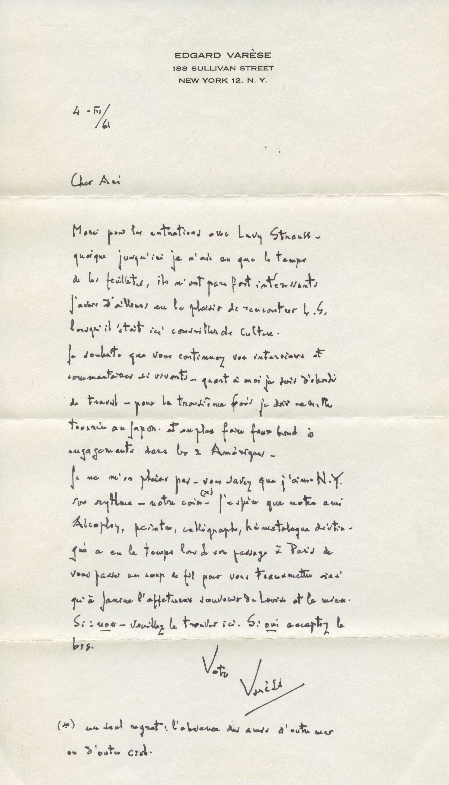 March 3, 1961. 1 p. Personal letterhead paper. Varèse thanks Charbonnier for his published interviews with Claude Levy-Strauss, whom he knew in person. Varèse had to postpone a trip to Japan for the third time. He affirms, "You know that I love New York, its rhythm, our neighborhood—just one complaint: the absence of our friends overseas and in heaven."