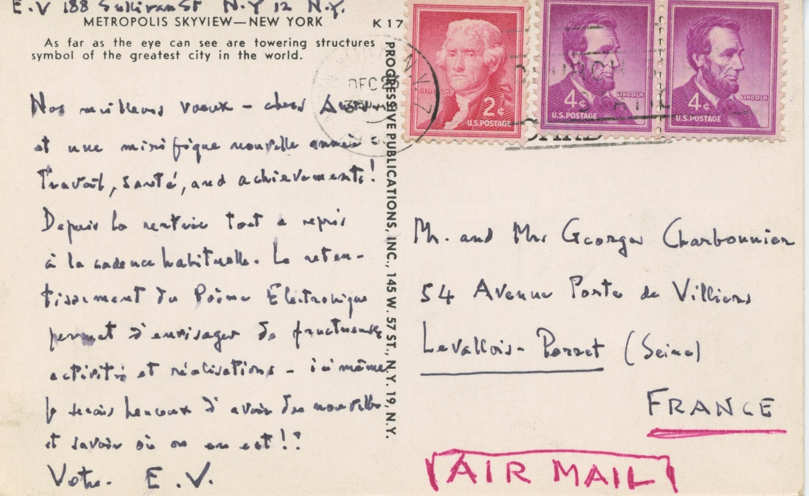 December 30, 1962. Aerogram. Varèse sends his best wishes for the new year to the Charbonnier family. Signed "Louise et Edg. Varèse" but both names are in Edgard's hand.
