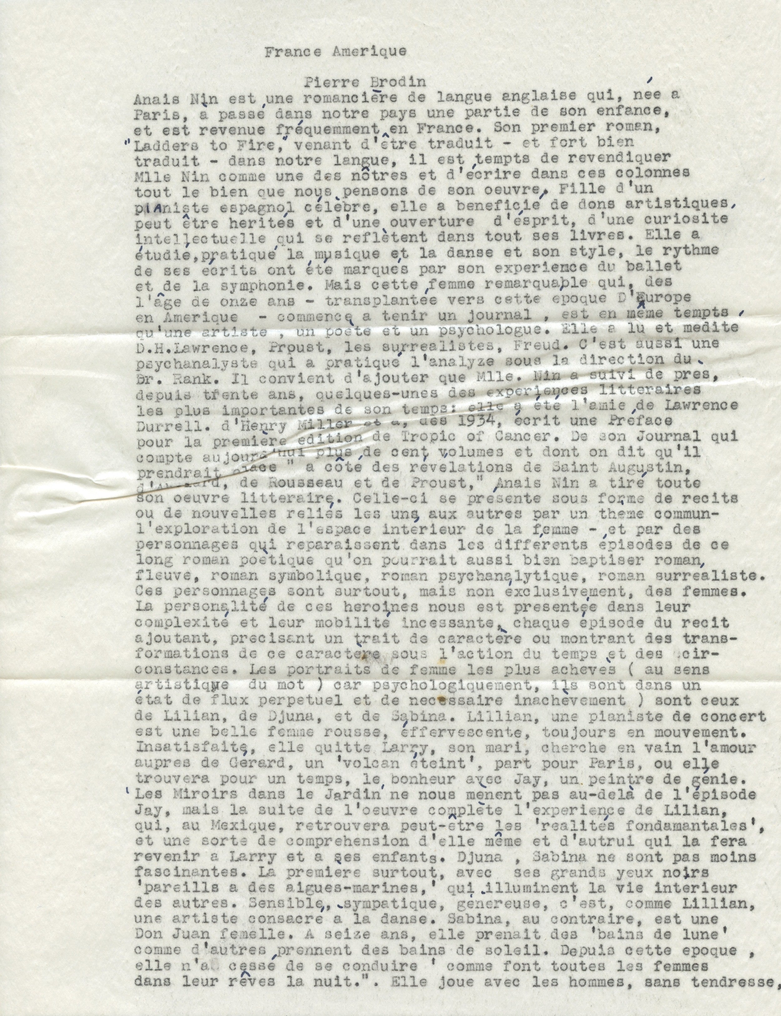 March 2, 1963. TLS with autograph postscript; envelope not extant. Louise writes on behalf of the writer Anaïs Nin, a friend of both Varèses. She hopes for Charbonnier to promote Nin's works in France ("Varèse and I would appreciate that personally"). She singles out Nin's novel Ladders of Fire (the first installment of her Cities of the Interior cycle), which has just been published in French translation as Les miroirs dans le jardin. She includes "some very enthusiastic reviews from here and from Canada"; three are part of this collection, one from France-Amérique (New York), one from Liberté (Montreal; both in typescript copy) and one from Prairie Schooner (in English). The manuscript postscript turns to Charbonnier's radio interviews with Edgard; Louise mentions that Le Corbusier and others had talked to her about them. She asks for a tape recording and suggests a publication in print.