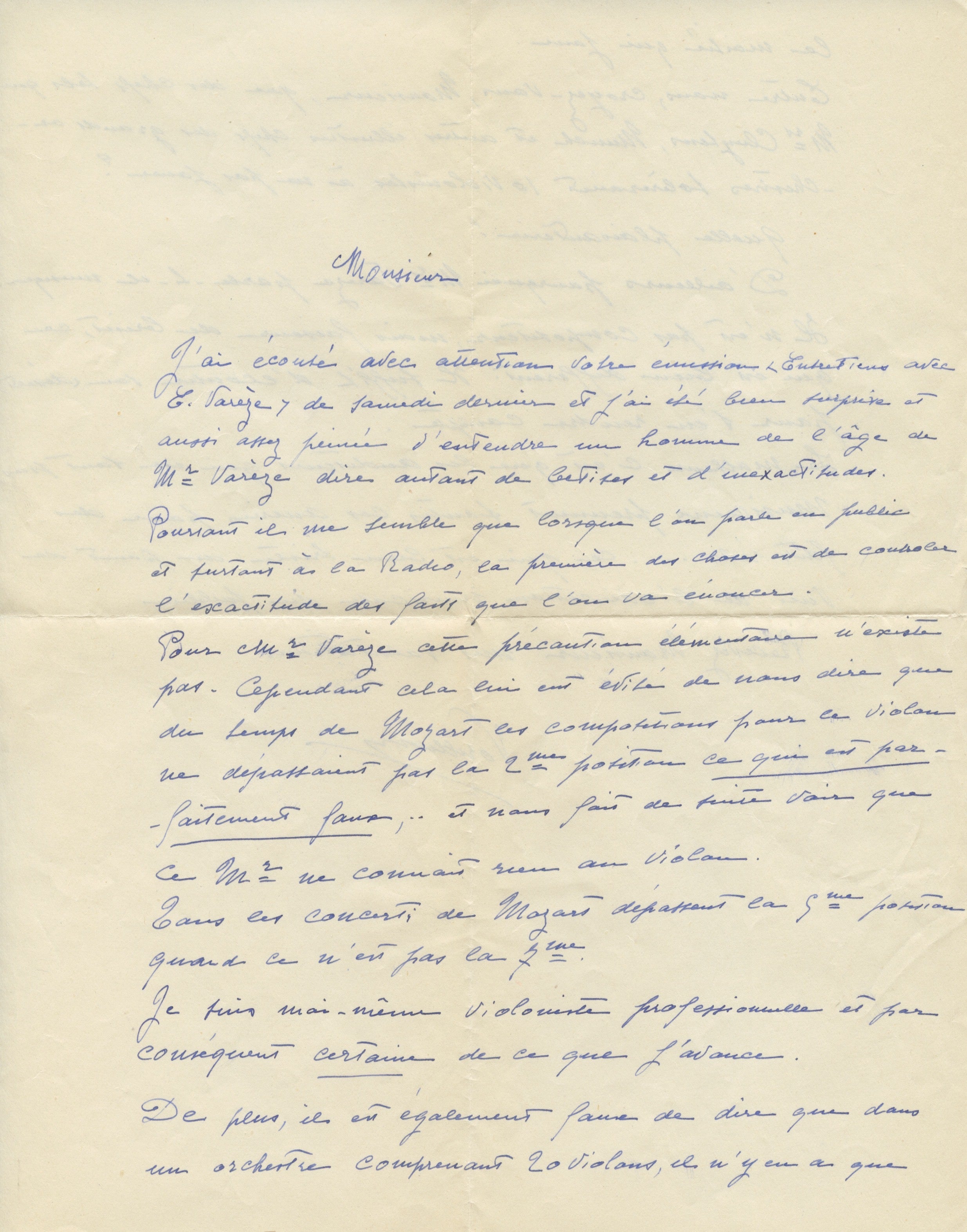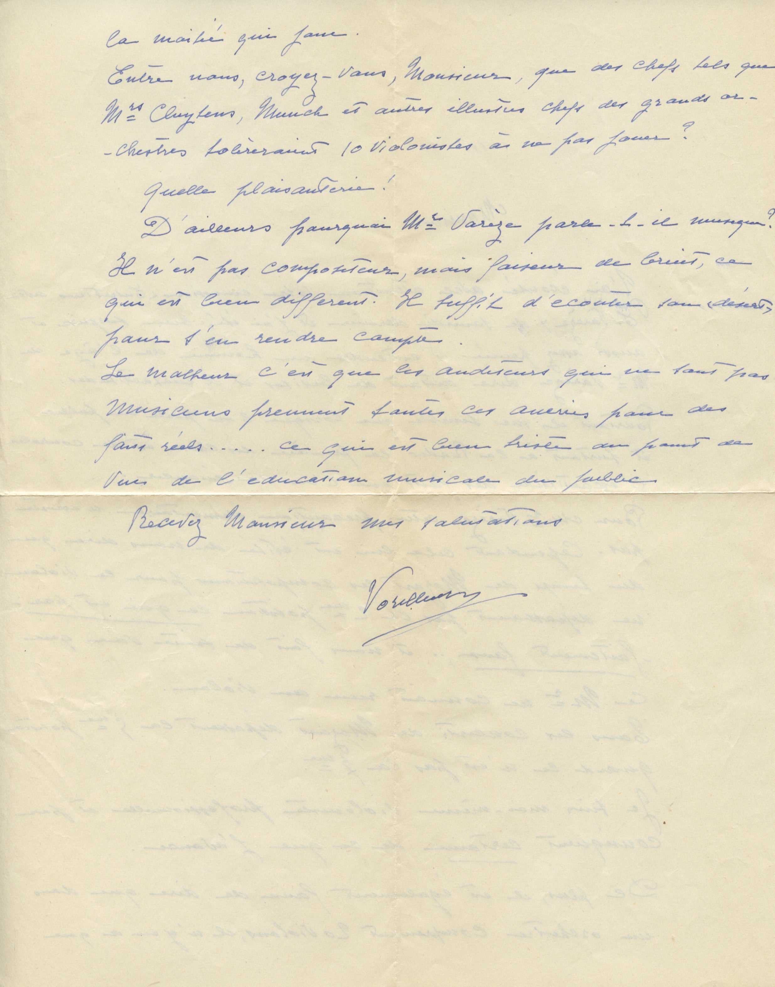 6. Five letters from listeners to Charbonnier, 1955 (4 ALS, 1 TLS); three with original envelopes. All in French. These letters respond to the broadcast of Charbonnier's interviews with Varèse. Most interesting is the TLS by the exiled Russian count Valentin Zoubov (1885–1969). In part: "As I am a former friend of Edgar Varèse of whom I lost sight in 1914, I have listened to your broadcasts with great interest, and I was glad to hear that he is doing well in America. In your interviews with him, I recognized his fighting spirit of old, if matured and moderated by the wisdom of age. You would do me a great favor if you could give me his correct address, as I would love to restore my contact with him."