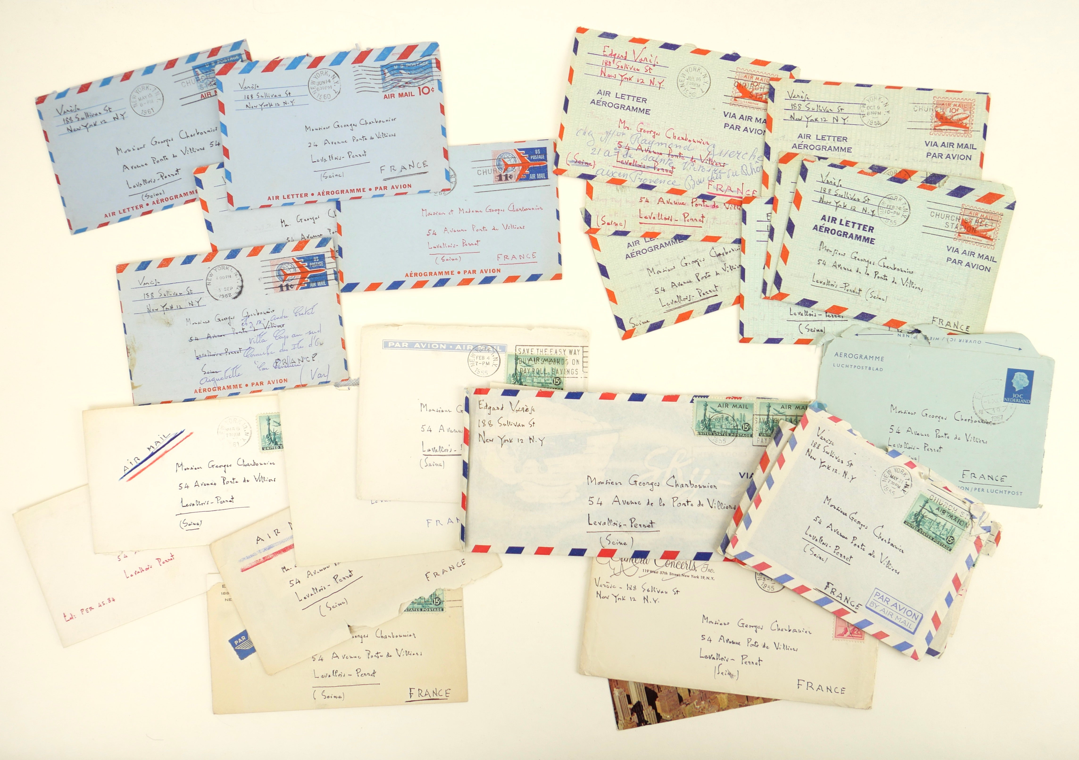 1. Twenty-three autograph letters signed from Edgard Varèse to the French journalist Georges Charbonnier, written between 1955 and 1963. All in French; from New York and in original autograph envelopes unless noted otherwise. Various formats. Complete listing of the letters: