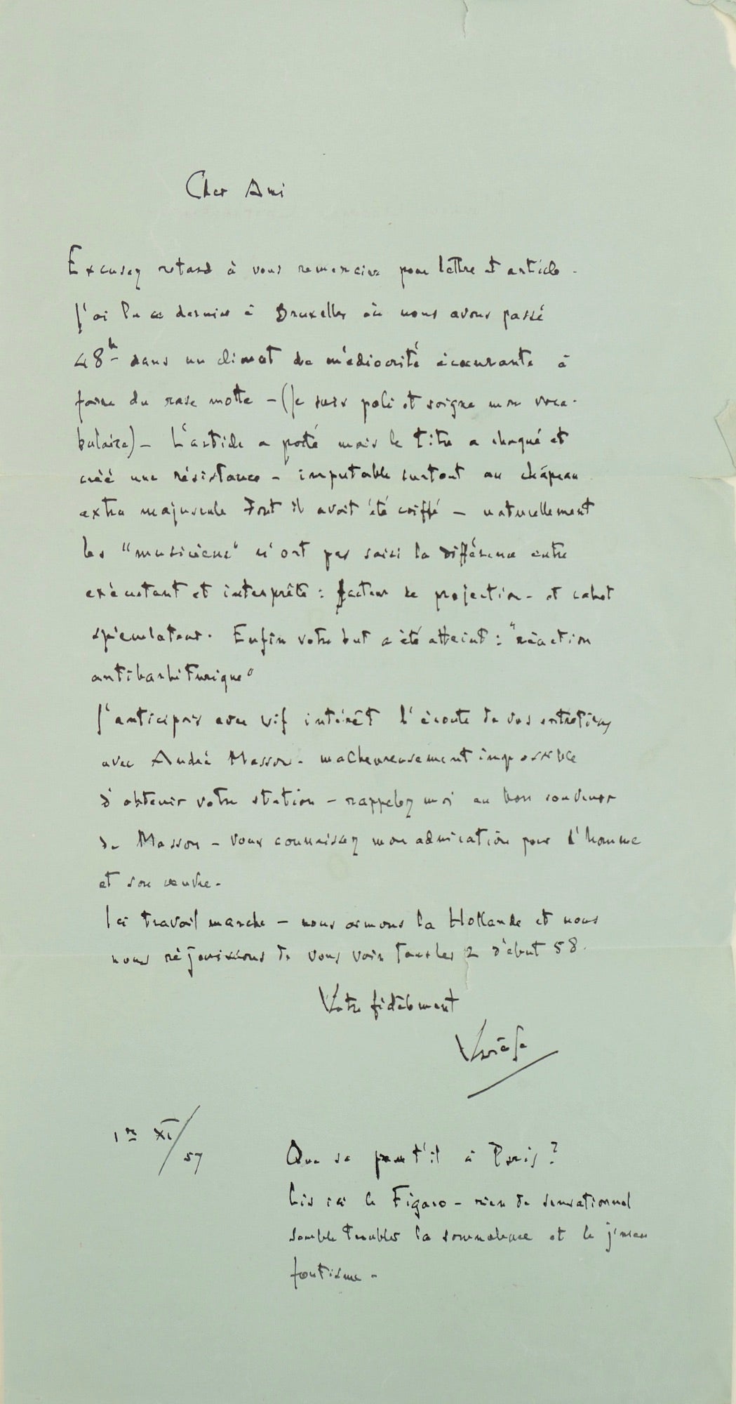 November 1, 1957. Eindhoven, the Netherlands. Aerogram of Royal Dutch Mail. Expresses disappointment about a two-day stay in Brussels "in a climate of mediocrity." He is looking forward to reading Charbonnier's radio interviews with the French artist André Masson.