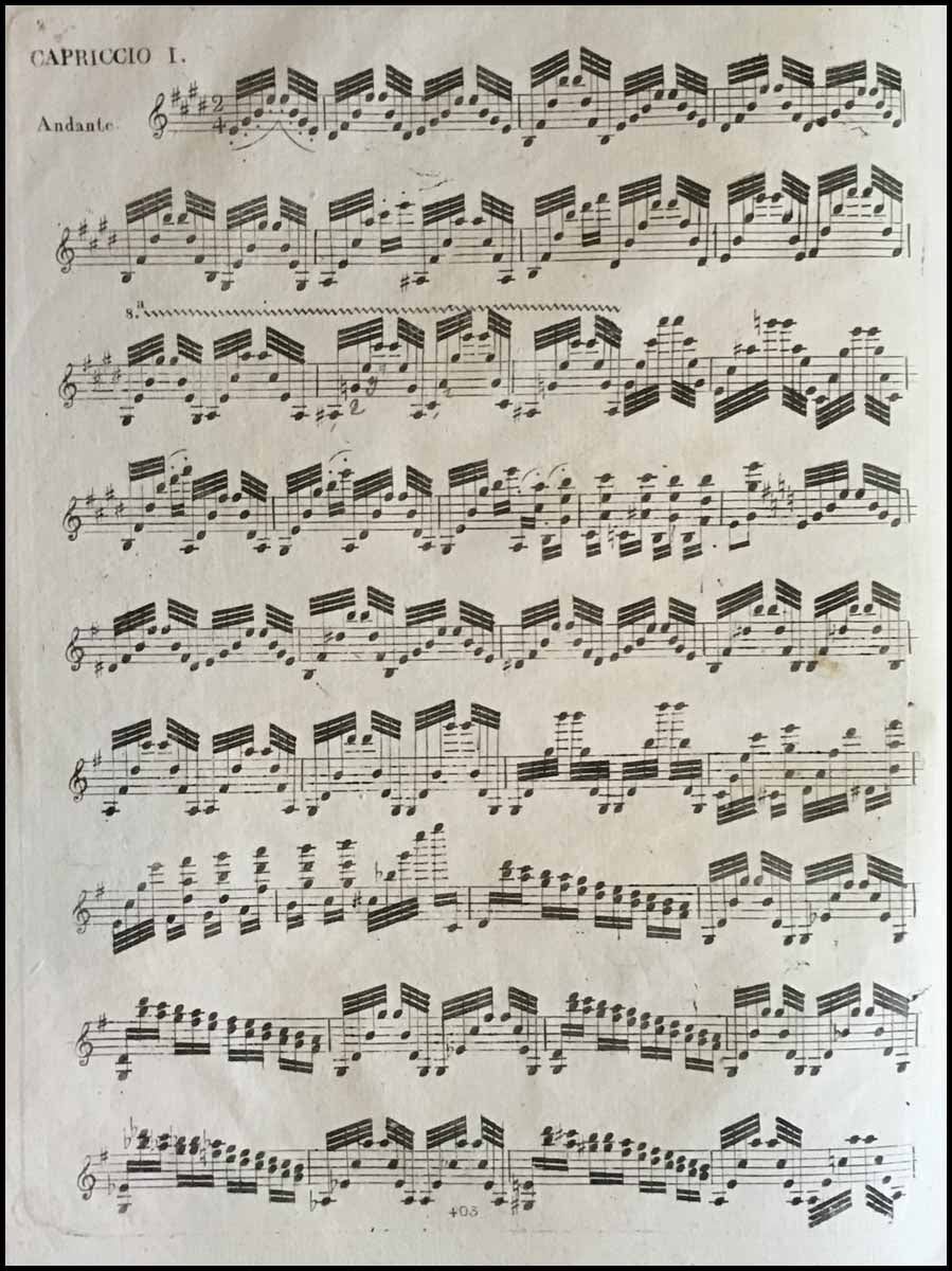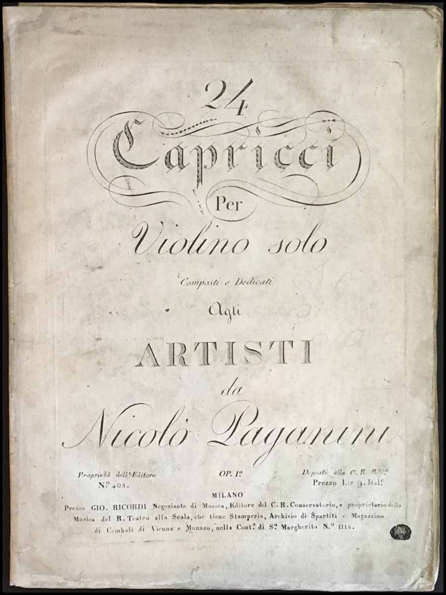 Paganini, Nicolò. (1782–1840). 24 Capricci Per Violino solo ... Dedicati agli Artisti. Op. Ia. - FIRST EDITION. Milano: Gio. Ricordi. [1820]. First Edition, First Printing. Upright folio. 46 p. Engraved. [PN] 403.Catalogo tematico p. 89; Fuld (rev. ed.) p. 455. A fine copy, with scattered light foxing, self-printed wrappers with some darkening around the edges and few small repairs to the borders.