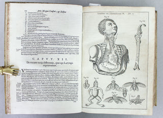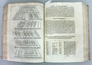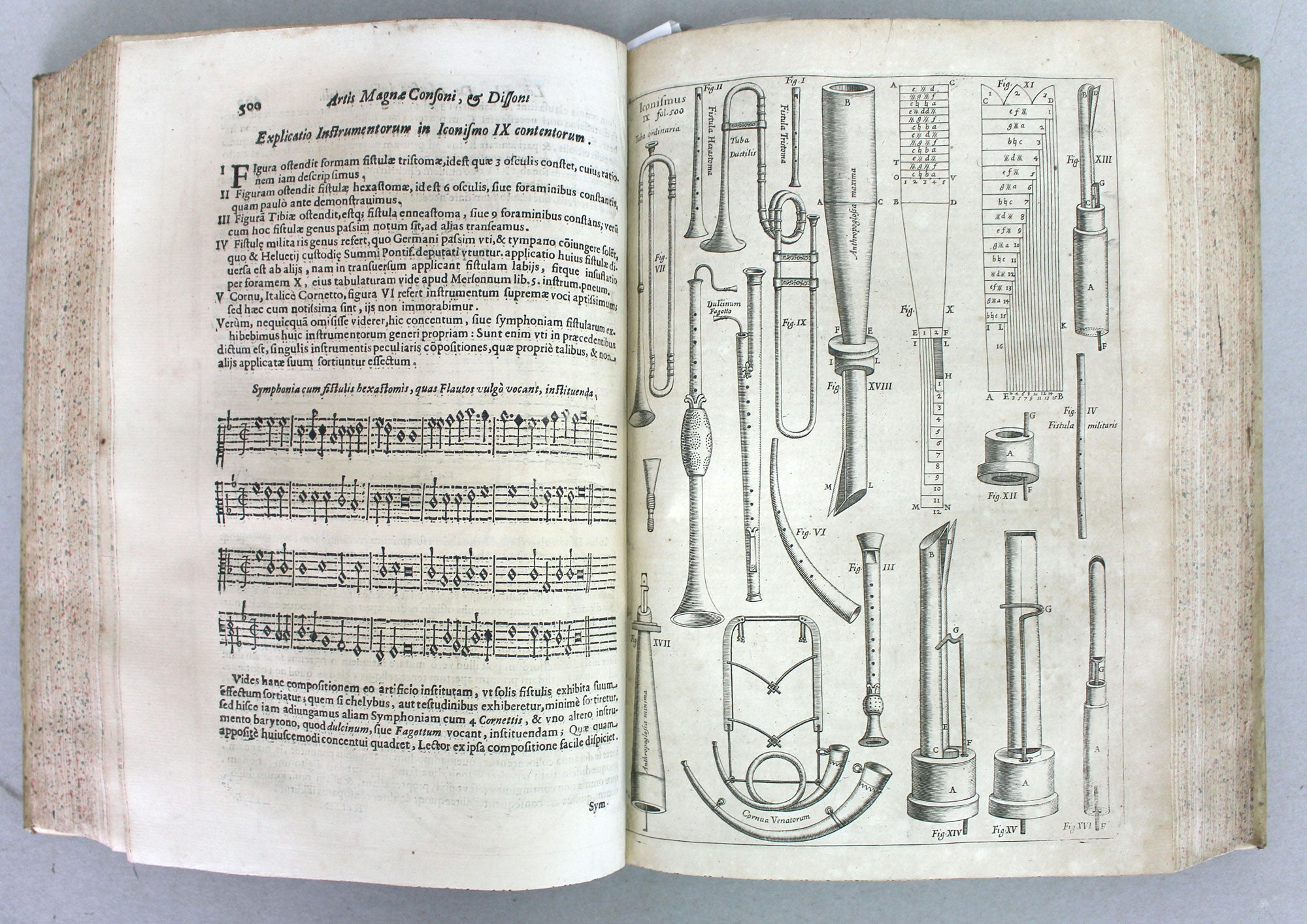 Part I: 1f. (fine full-page engraved pictorial title by Baronius after a drawing by Paul Schor, incorporating a Canon Angelicus for 9 choirs of 36 voices), 1f. (recto title with vignette, verso contents), 1f. (fine full-page dedicatory engraving of Leopold-Guillaume, Archduke of Austria, by Paul Ponti after Paul Schor, dated 1649), 9ff., 690 (=692) pp. + 11 numbered plates (I-X, XIII) printed on one side of each of 10 leaves; Part II: 2ff. (title with vignette, fine full-page engraved frontispiece), 462 pp. + 18 ff. (indexes and errata) + 12 numbered plates (XI-XI, XIV-XXXIII) printed on one side of each of 11 leaves. The two volumes thus contain 3 unnumbered full-page plates together with 23 numbered plates printed on 21 leaves (plates IV and V are printed on a single leaf, as are plates XI and XII). The plates are all finely engraved and illustrate a variety of musical instruments, among them the harpsichord, organ, strings and winds. With numerous woodcut illustrations, diagrams, tables, etc. within text, including many of musical instruments. Musical examples printed typographically in diamond-head notation, including many of various musical forms including multiple contrapuntal part-writing. Some mispagination to Part I at pp. 554-560 and errors in pagination from page 577 on. Contemporary vellum (somewhat stained and rubbed. Some slight staining or browning, initially slightly tidemarked, folding plates some small tears in margin, title of part I with restored tear lower right.