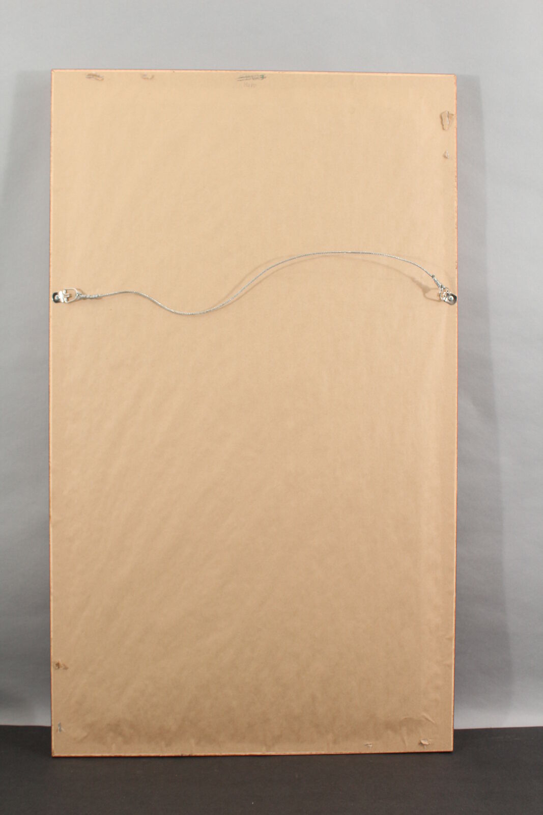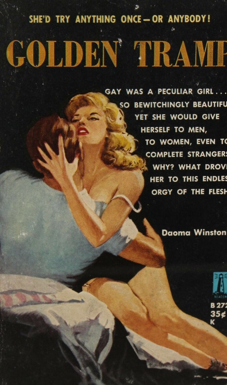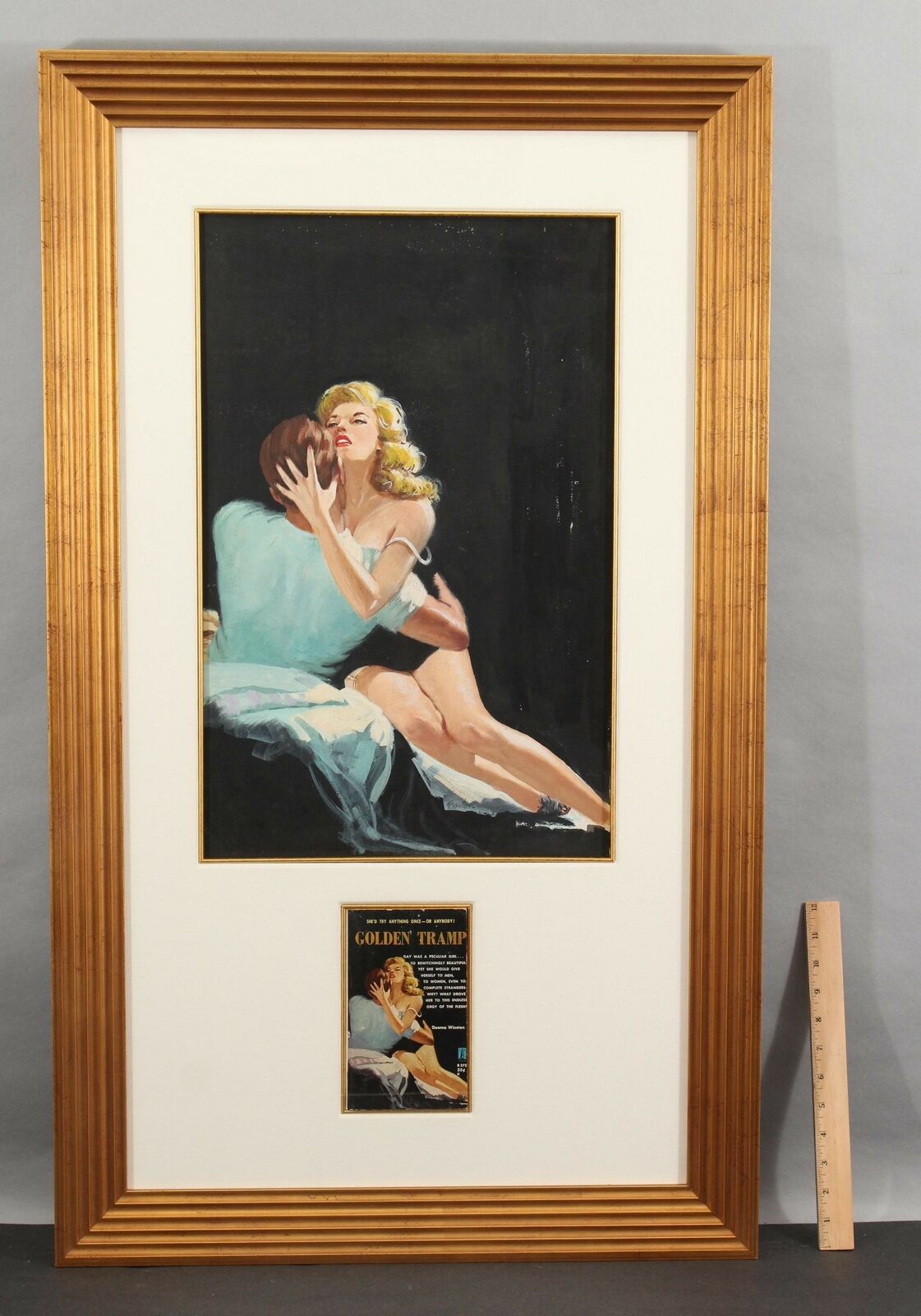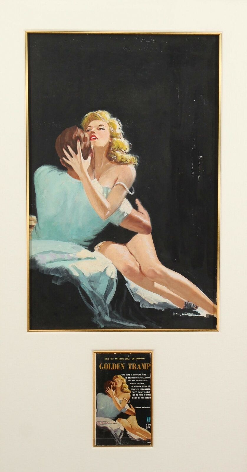 Original oil painting by New York-based illustrator Harry Barton used as the cover to the 1959 pulp novel Golden Tramp by Daoma Winston (1922–2013), framed together with a copy of the book, Beacon #B272. Painting unexamined out of frame, but appears to be in very fine condition, 14 x 22 inches (35.6 x 55.9 cm.), framed to 24.25 x 41 inches (61.6 x 104.1 cm.).