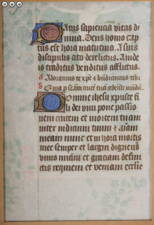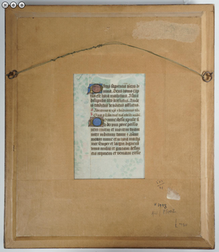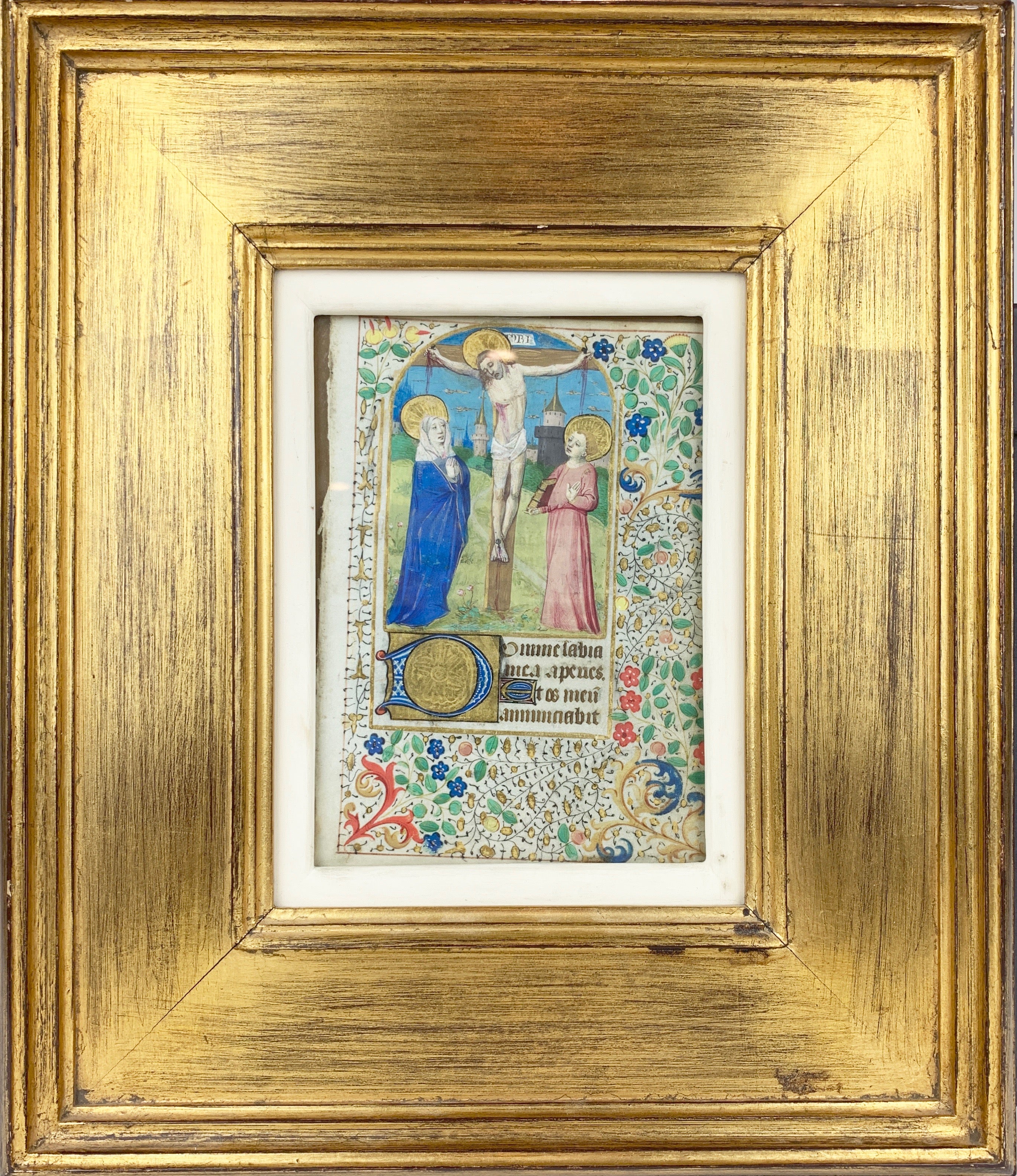 The dramatic miniature painting depicts Christ on the Cross topped by a narrow plaque inscribed “INRI”. Blood spurts from a wound in Christ’s side. Turreted buildings of a town and castles and hills are evident in background. The Virgin Mary in blue stands his right and Saint John in pink to his left, above the Latin text "Domine labia mea aperies et os meum adnuntiabit" ("O Lord, open thou my lips and make it known"). The text is a portion of a line from Psalm 50, also known as a psalm of Asaph, which reads in full as "Domine, labia mea aperies, et os meum annuntiabit laudem tuam," ("O Lord, open thou my lips and my mouth shall shew forth thy praise.") A viewing window on frame verso leaves visible the other side of the page, which includes a lengthier text in Latin, with two illuminated initials. Recto painting slightly visible through verso.