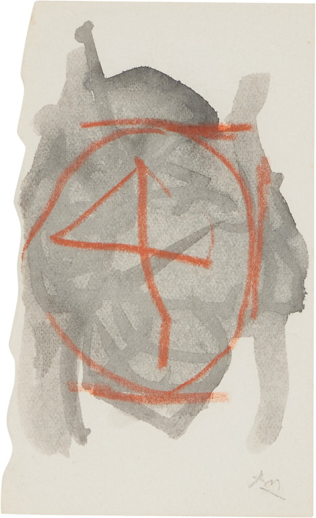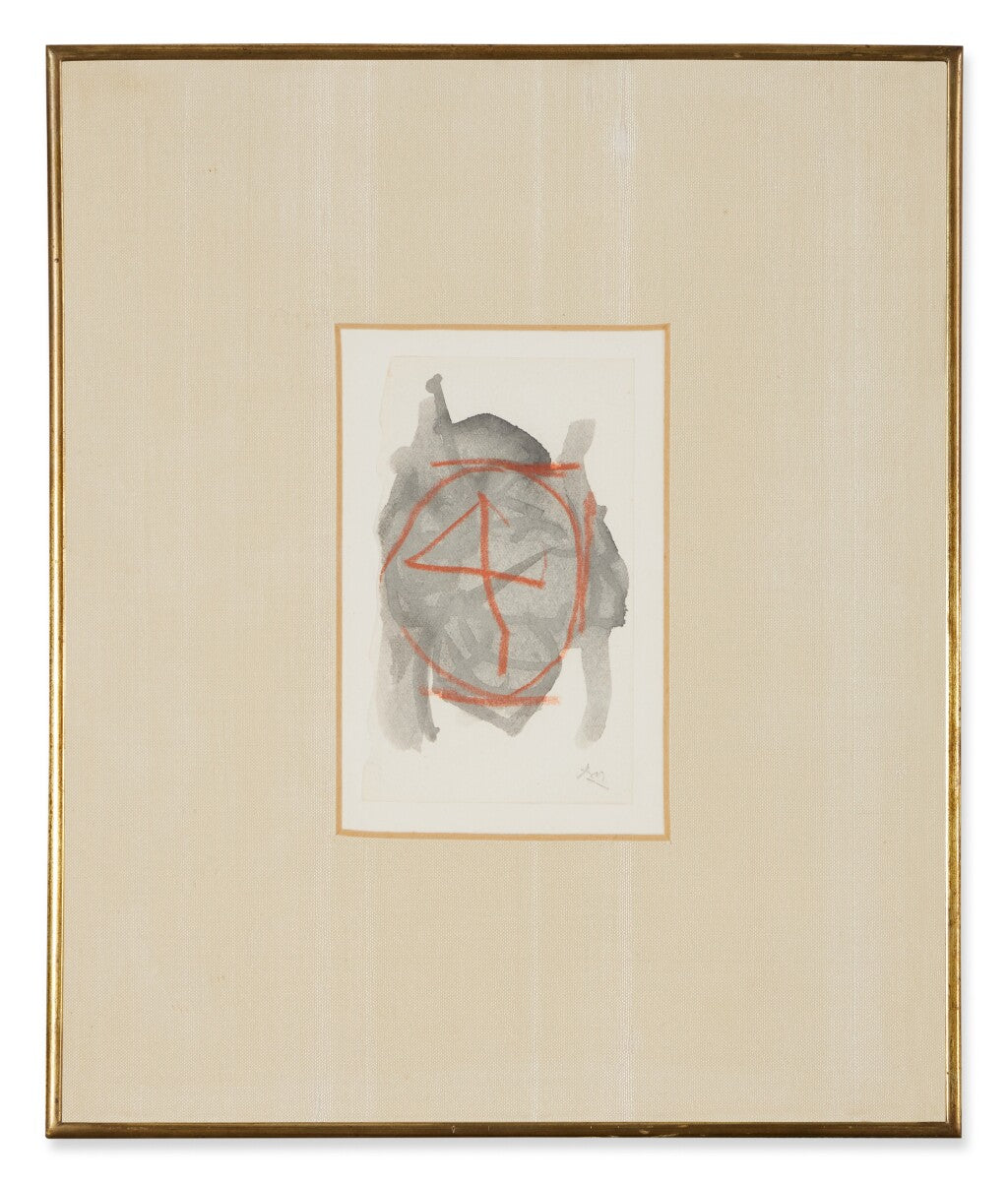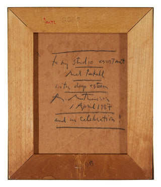 Ink and crayon on paper, executed in 1987.  Signed with the initials RM to lower right; signed "R. Motherwell", dated 1 April 1987, with an inscribed note to the backing board which reads, "To my studio assistant Mel Paskell with deep esteem and in celebration!" In very good condition overall, sheet hinged at the corners of the reverse to the backing board, left edge of the sheet irregularly torn by the artist; faint discoloration to the extreme edges of the sheet, visible upon close inspection; pale fox marks along the right edge of the sheet, visible upon close inspection. 4⅞ by 3 in.; 12.4 by 7.6 cm. Matted and framed under plexiglas to overall 12⅛ by 10¼ in; 30.8 by 26 cm.