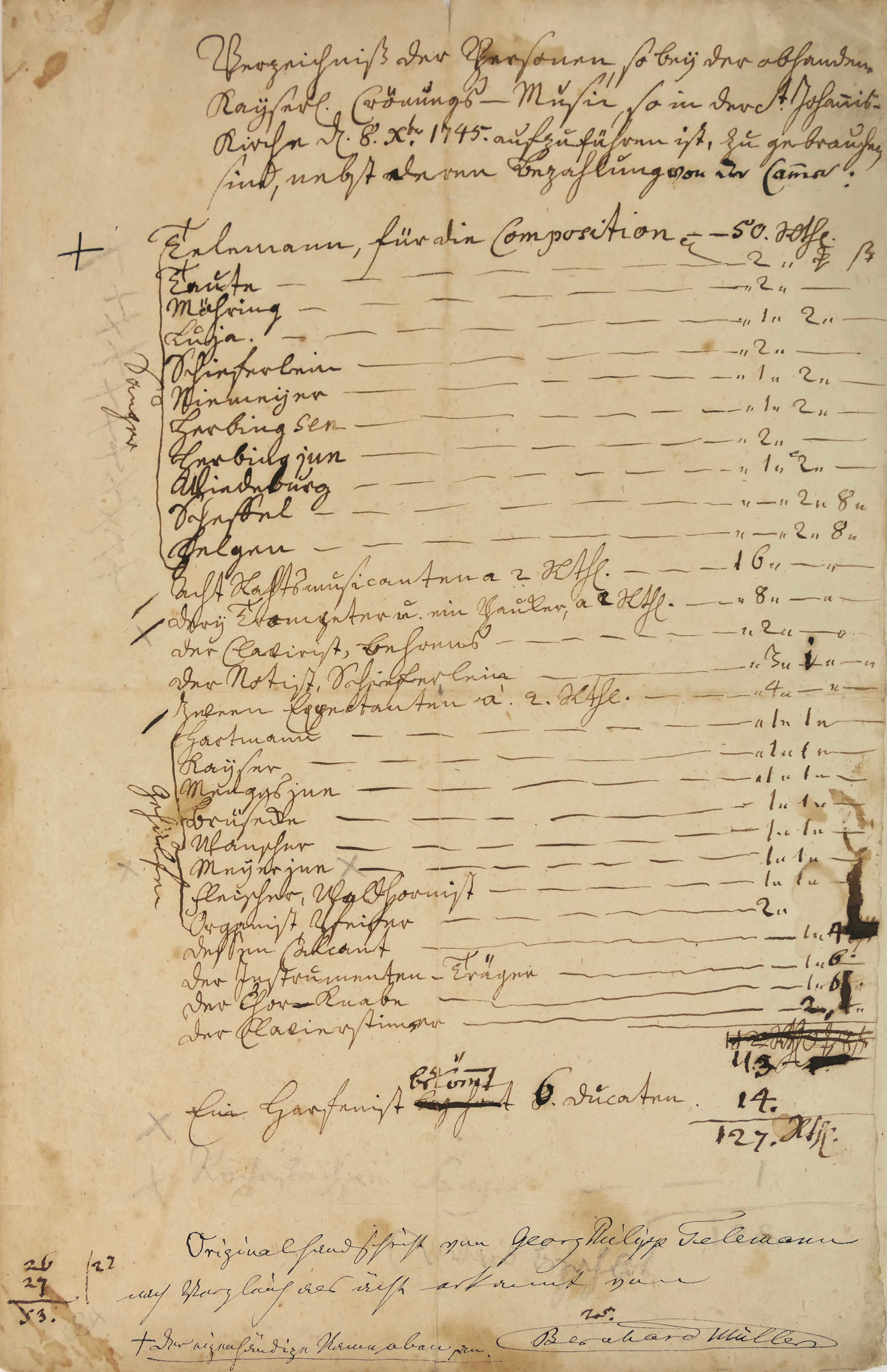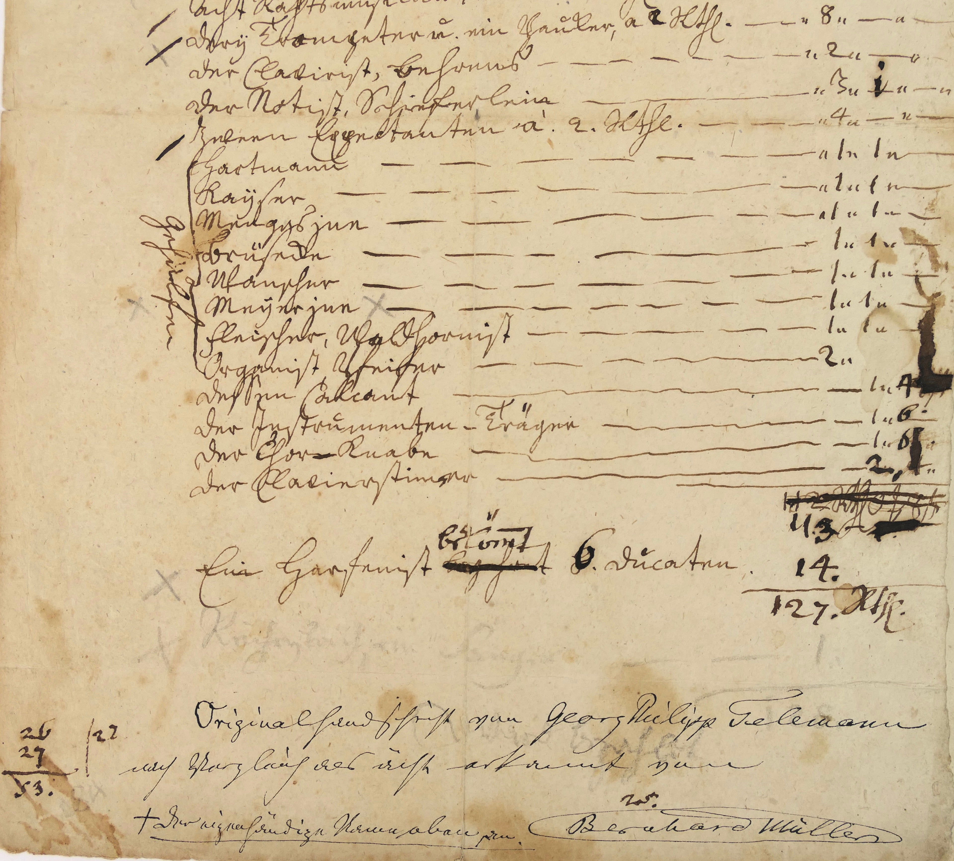 This important document is the list of people needed to perform the festive music for the Emperor's coronation in St. John's Church on December 8, 1745, with the salary to be paid to each. At the head of the list is "Telemann, for the composition" (50 Reichsthaler); followed by the names of the participants with their salaries. Most of the participants are grouped into two categories with curly brackets: singers (ten names) and assistants (eight Rathsmusicanten), 3 trumpeters and a timpanist, a clarinetist, a copyist (Notist), the horn player, the organist, etc., down to the instrument bearer, the tuner, and a harpist. The full costs amounts to 127 Rthl. Of great social-historical interest are also these other listed participants, the many, mostly nameless, helpers without whom such an event could not take place and who are so quickly forgotten. This part of the list gives an impression of the additional services required in the mid-18th century for such a celebratory concert, with the organist needing not only a bellows player but also a keyboard tuner.