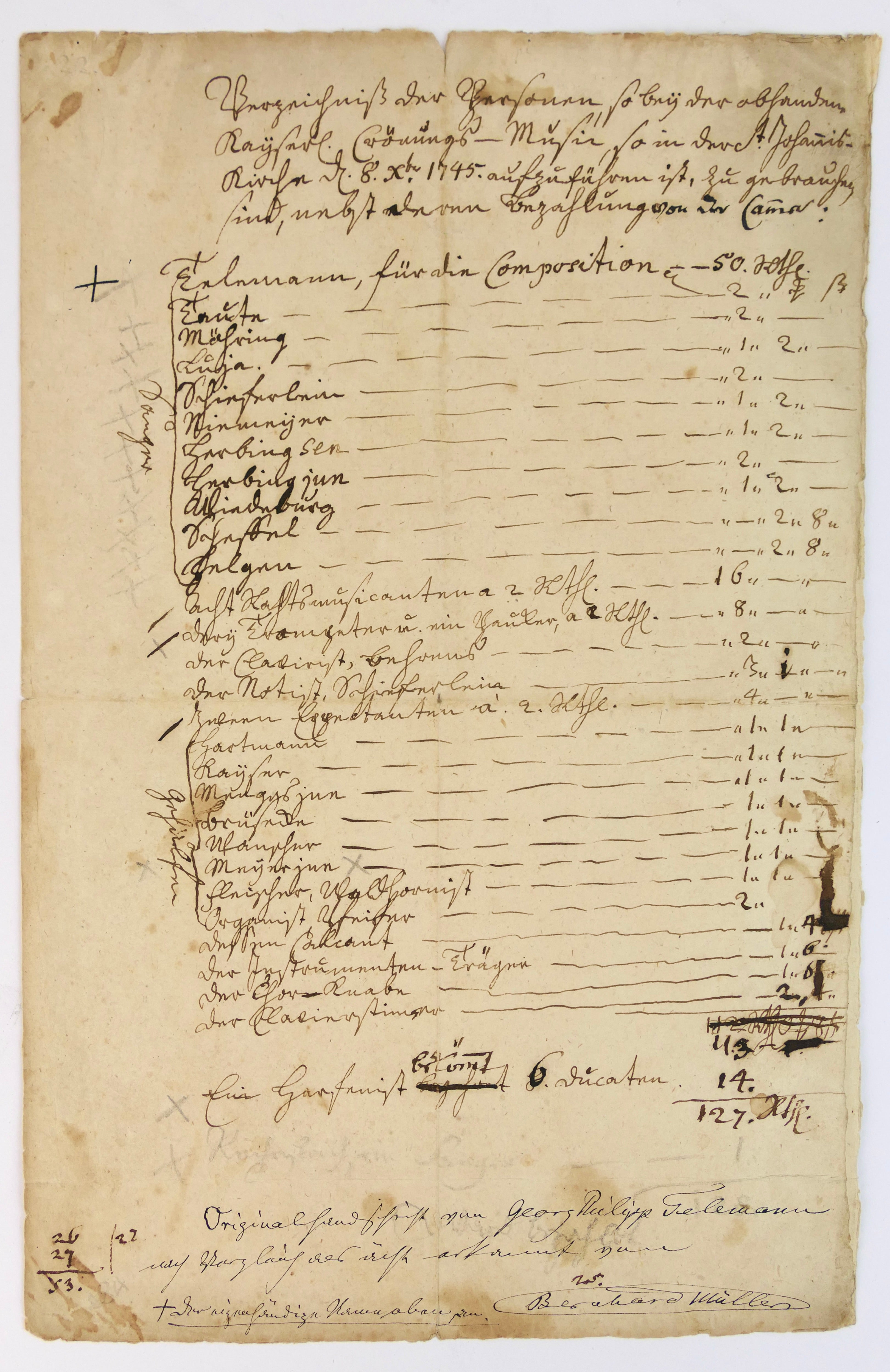 "Verzeichnis der Personen, so beÿ der absenden Kaÿserl. Cronungs-Music, so in der St Johannis-Kirche d. 8 Xbr. 1745 aufzufuhren ist, zu gebrauchen sind, nebst deren Bezahlung..." [“List of the persons to be employed for the aforementioned Imperial Coronation Music, to be performed in St. John’s Church on January 8, 1745, along with their payment by the Chamber.”] Autograph manuscript with the composer's name in the text, "Telemann" [his name with the characteristic initial letter, as seen in his signature], partially autograph and with additional autograph emendations and additions by the composer himself. Document partially in the hand of Telemann's principal Hamburg copyist (Hauptkopist A), with notable differences in the hand and darker inks being those of the composer. For example, we note the difference of writing and ink between the first grouping of names and the second; the end of the fourth line at the head (adding "from the chamber"), and the darker writing again and cancellations towards the conclusion. [Hamburg, circa September-October] 1745; 1 folio page. Right margin reinforced, a few small stains, overall fine.