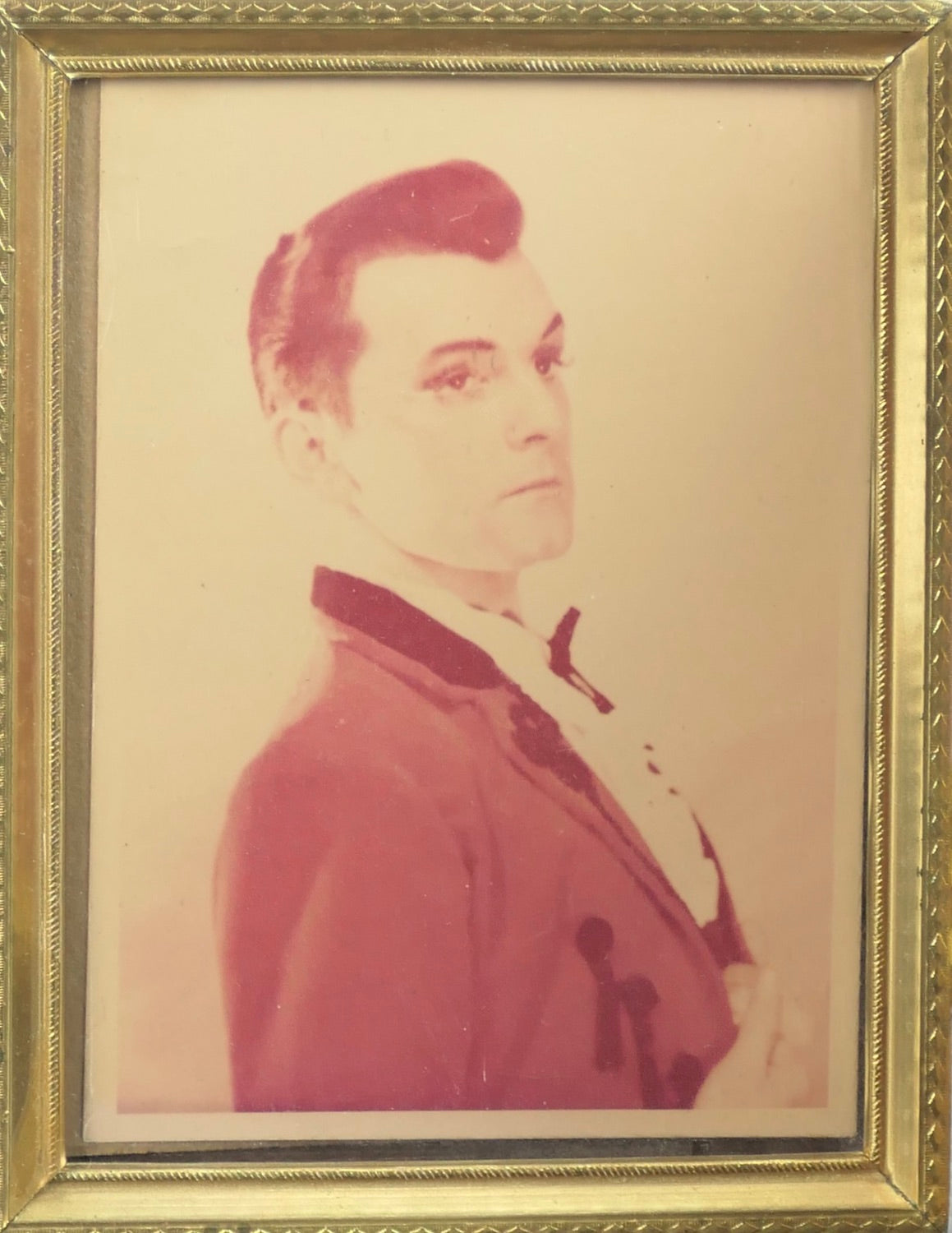 An amusing painting somewhat in the style of late Picabia, with associated ephemera. The portrait, by an unidentified artist signing as "Giles, 1958" is of Paul McMahon, a critic, photographer and artist who worked for more than 13 years touring with Marlene Dietrich as the icon’s stage manager, announcer, dresser, secretary and escort, and later spent 25 years as an arts and entertainment reviewer and photographer with Gay Community News, Esplanade, Tommy’s Connection, The Mirror, Bay Windows and other publications. McMahon began his career as a dancer and actor (he can be seen in a small role in the 1956 film Carousel, for example) and for a time toured in a dance duo performing a Spanish-inflected ballet. The present painting is sold together with the costume jacket and castanets depicted in the painting, as well as two photographs of him and his dance partner in this attire. Campy, fun. Framed painting measures 28 x 22 inches (71 x 56 cm).