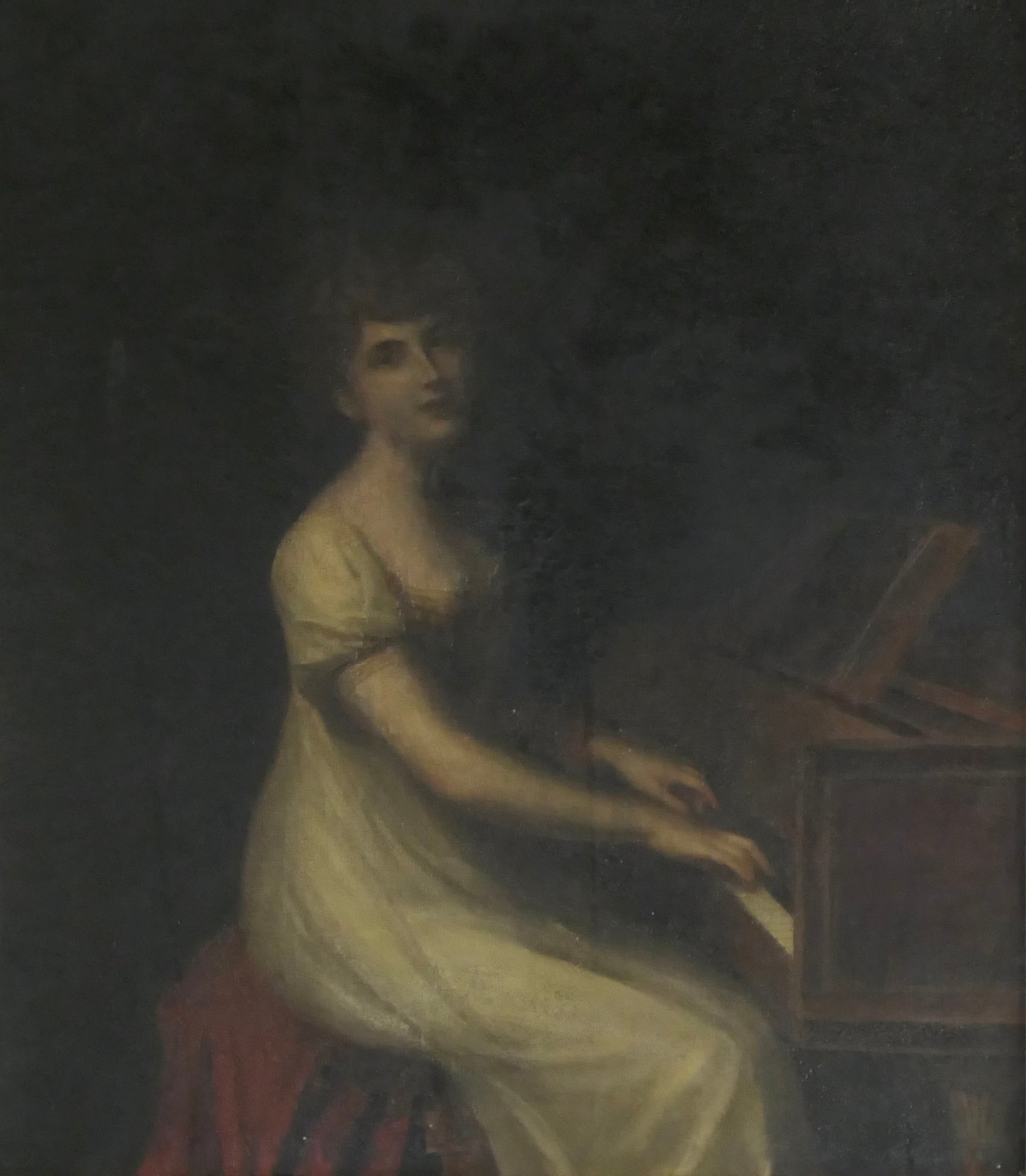 A fine original painting, unsigned, no place, no date, oil on panel, of an anonymous woman seated at a keyboard and looking longingly outwards at the viewer. The canvas verso inscribed "Madame Auguste Bois...-Rufini," though we have not been able to trace any figure of this name. The work is heavily over-varnished and in need of a good cleaning but otherwise in good condition. Set in a period gilt frame. Approx. framed to 22 x 20 inches.