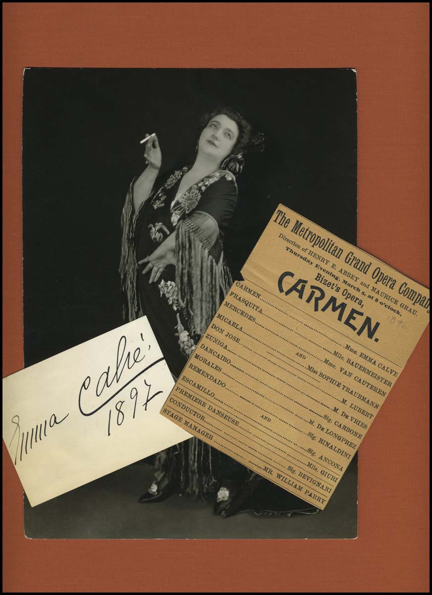 Calvé, Emma. (1858–1942). Carmen Ensemble. A fine group of items from the great soprano, most famous for her portrayal of this role. Includes an autograph signature, a Met Carmen program clipping, and an original photograph as Carmen, 17 x 23.5 cm.