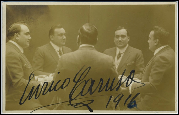 A highly unusual signed Mirror/Multi-photograph of the great tenor, taken at the Myers-Cope Co. photography studio in Atlantic City, NJ. Caruso is shown playing cards at a round table with five surrounding images of himself. The image was made with two mirrors that multiply the images of the subject and only the back view is real while the other four are reflections. This example has been boldly signed "Enrico Caruso / 1916" and is in very fine and crisp condition. 8.7 x 13.7 cm.