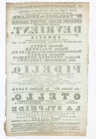 [Dance & Opera] Taglioni, Marie. (1804-1884); Elssler, Fanny. (1810-1884); Malibran, Maria. (1808-1836); Schröder-Devrient, Wilhelmine. (1804-1860); Pasta, Giuditta. (1797 - 1865) Theatre Royal, Covent Garden 1833 Broadside including "Fidelio" and "La Syl