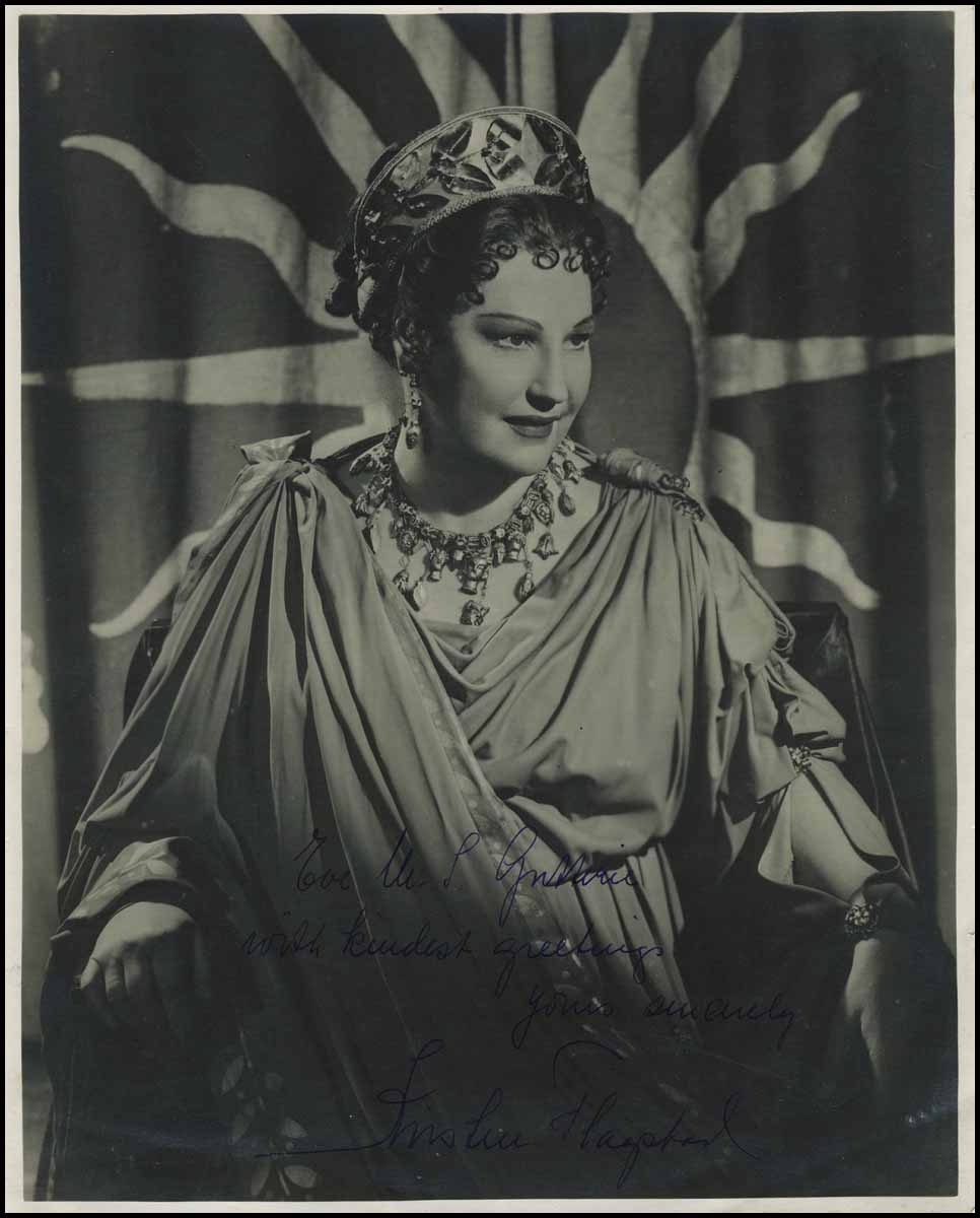 Boldly signed 8 x 10 inch early photograph from the supreme Norwegian soprano, shown in full costume as Dido in Purcell's Dido and Aeneas at the Mermaid Theatre (in the 1951 Festival of Britain season). The portrayal was recorded (in studio), and issued by EMI in January 1953. Inscribed and signed in blue ink "Kirsten Flagstad." A superb example of an uncommon signed image.