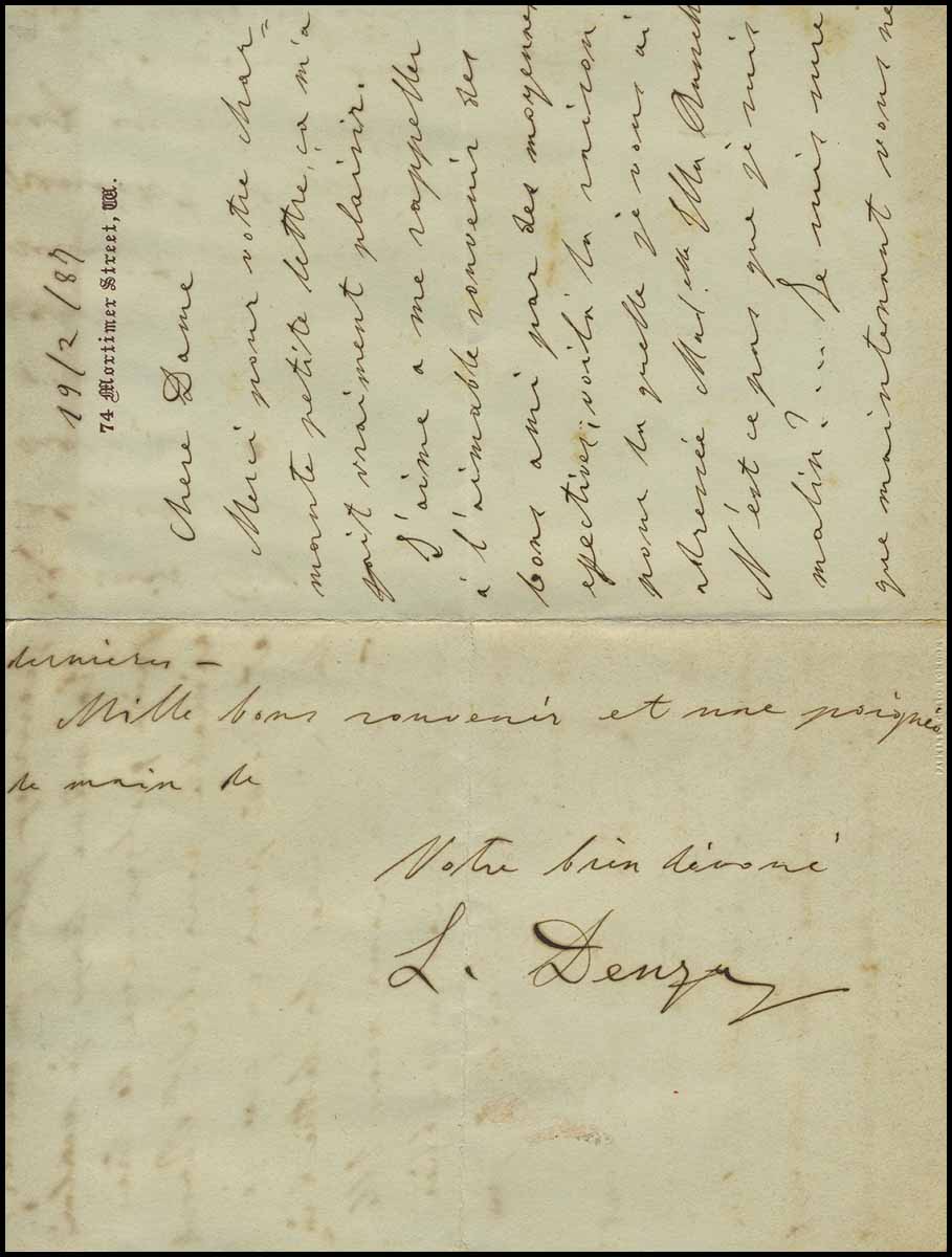 Autograph letter from the Italian composer of more than 600 songs, including the celebrated "Funiculi funicula." 19 Feb., 1887. 4 pp. In French, with complete typed transcription. Friendly content, even a bit flirtatious, evidently to a former female student, joking about calling her "Mad.elle," noting "what an egoist I am!," fondly recalling their time in Nice and lamenting that he is too occupied presently in London except to depart in August and September, asking if she might visit the "foggy country," perhaps in the spring, and noting that he is sending her some of his Songs of May. In fine condition. From the collection of the Contessa Cais di Pierlas-Mocenigo.
