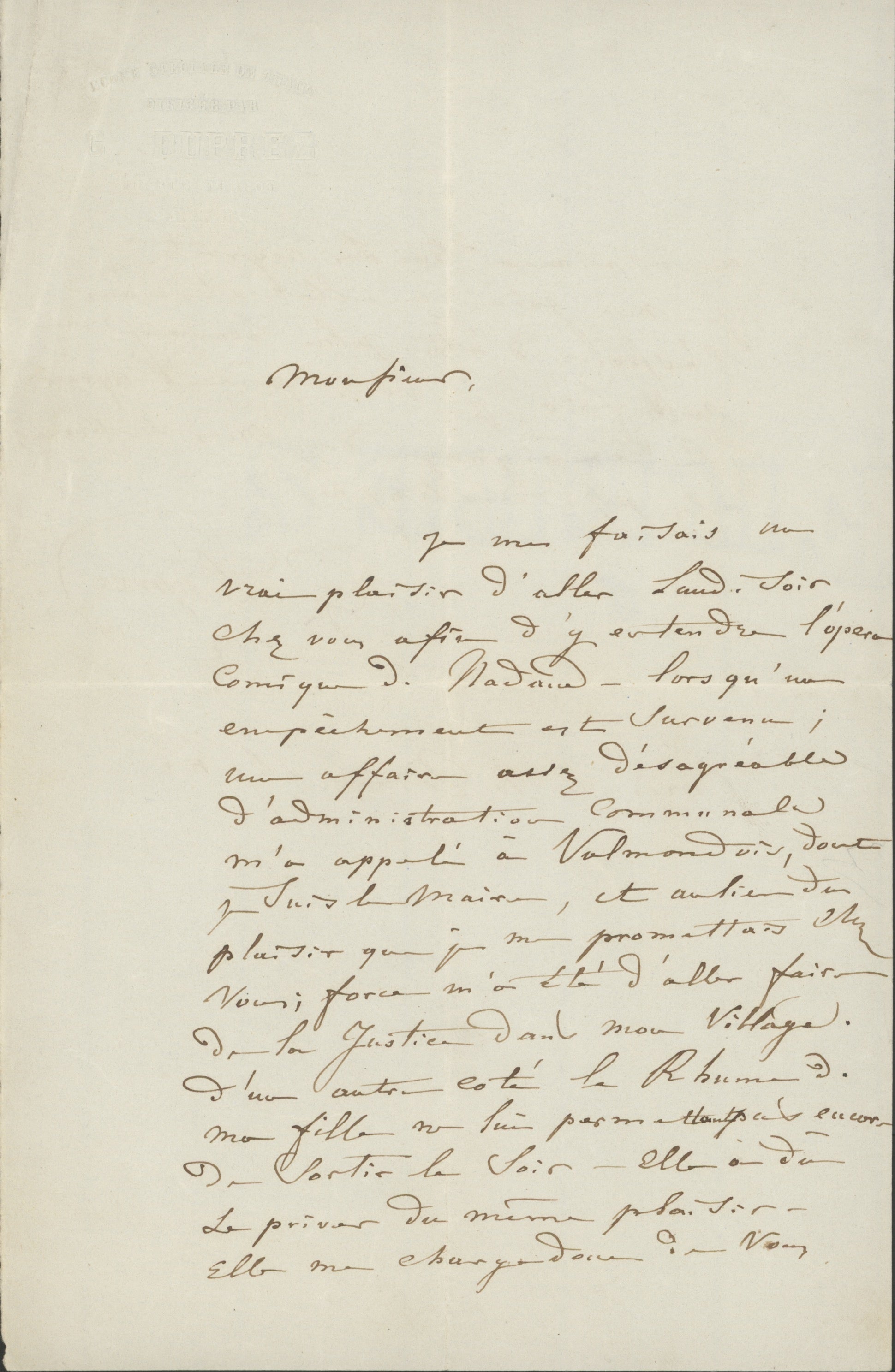 ALS from the French tenor and composer to an unknown individual, expressing regret for being unable to attend a recent social gathering. 1 March 1854; 2 pp. on embossed personal stationary. Duprez writes that he would have been happy to attend, but was called away to his home in Valmondois by (translated from the French) "an unpleasant matter of municipal administration." Expected mailing folds, else in fine condition. 5.5 x 8.25 inches (14 x 21 cm.).