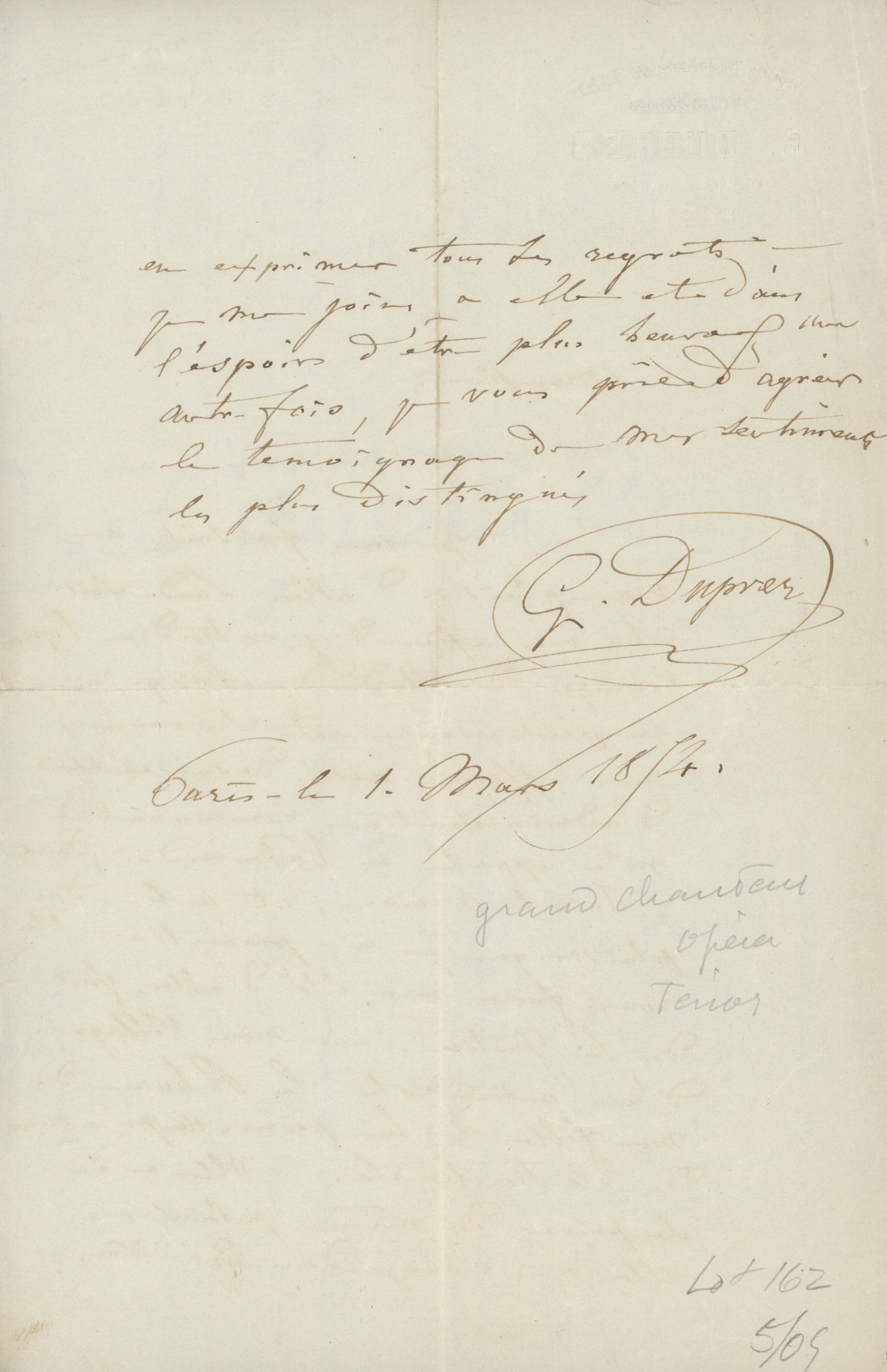 Duprez, Gilbert. (1806–1896). Autograph Letter Signed.