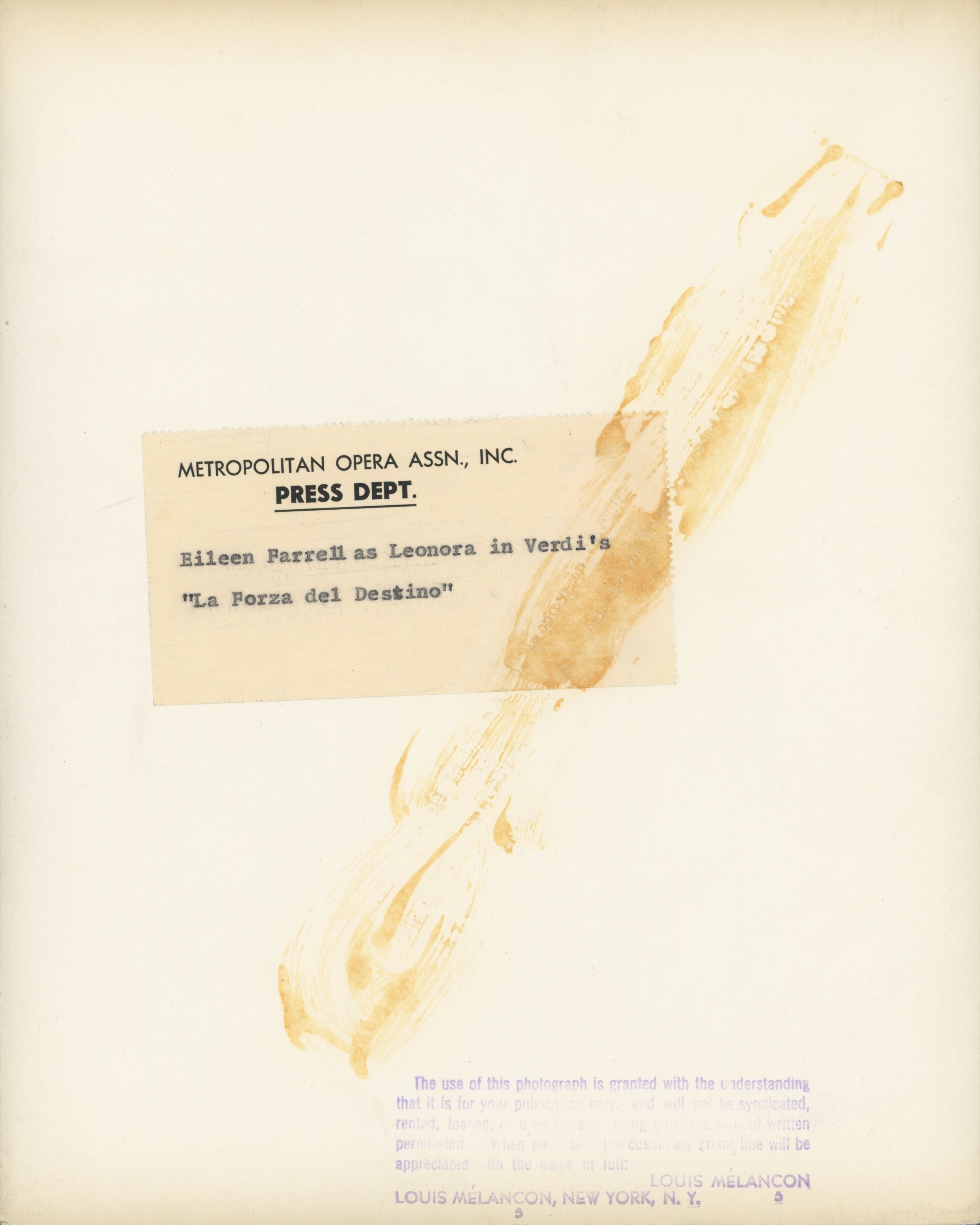 Signed Louis Mélançon of New York photograph of the American soprano, who has inscribed "To Paul / Eileen Farrell" in black to the upper left, in costume as Leonora for a production of Verdi's La forza del destino. Metropolitan Opera Press Department label and photographer's stamp to verso. Mounting remnants to verso, overall in fine condition. 8 x 10 inches (20.3 x 25.4 cm.). Together with a typewritten press note previously mounted to verso.