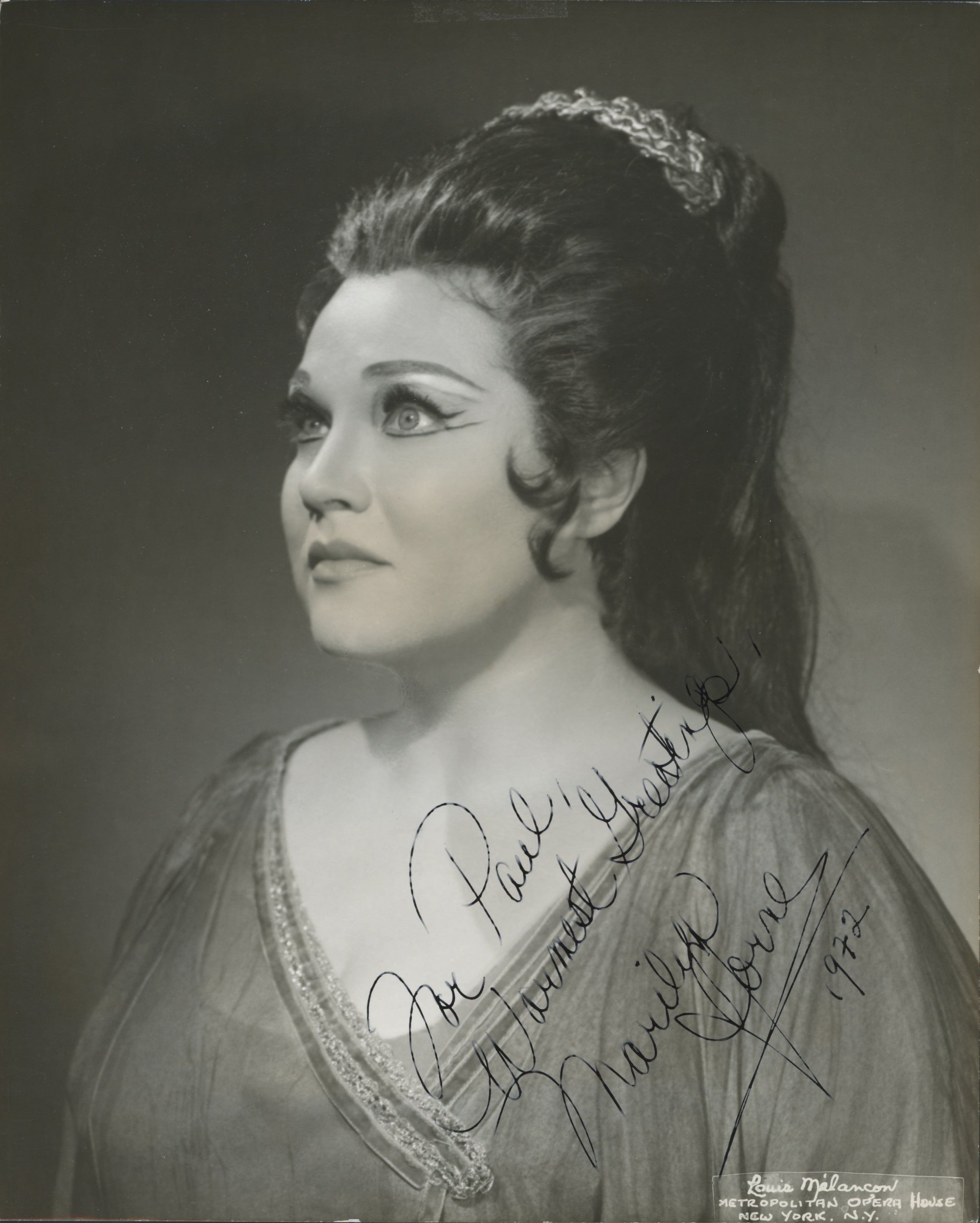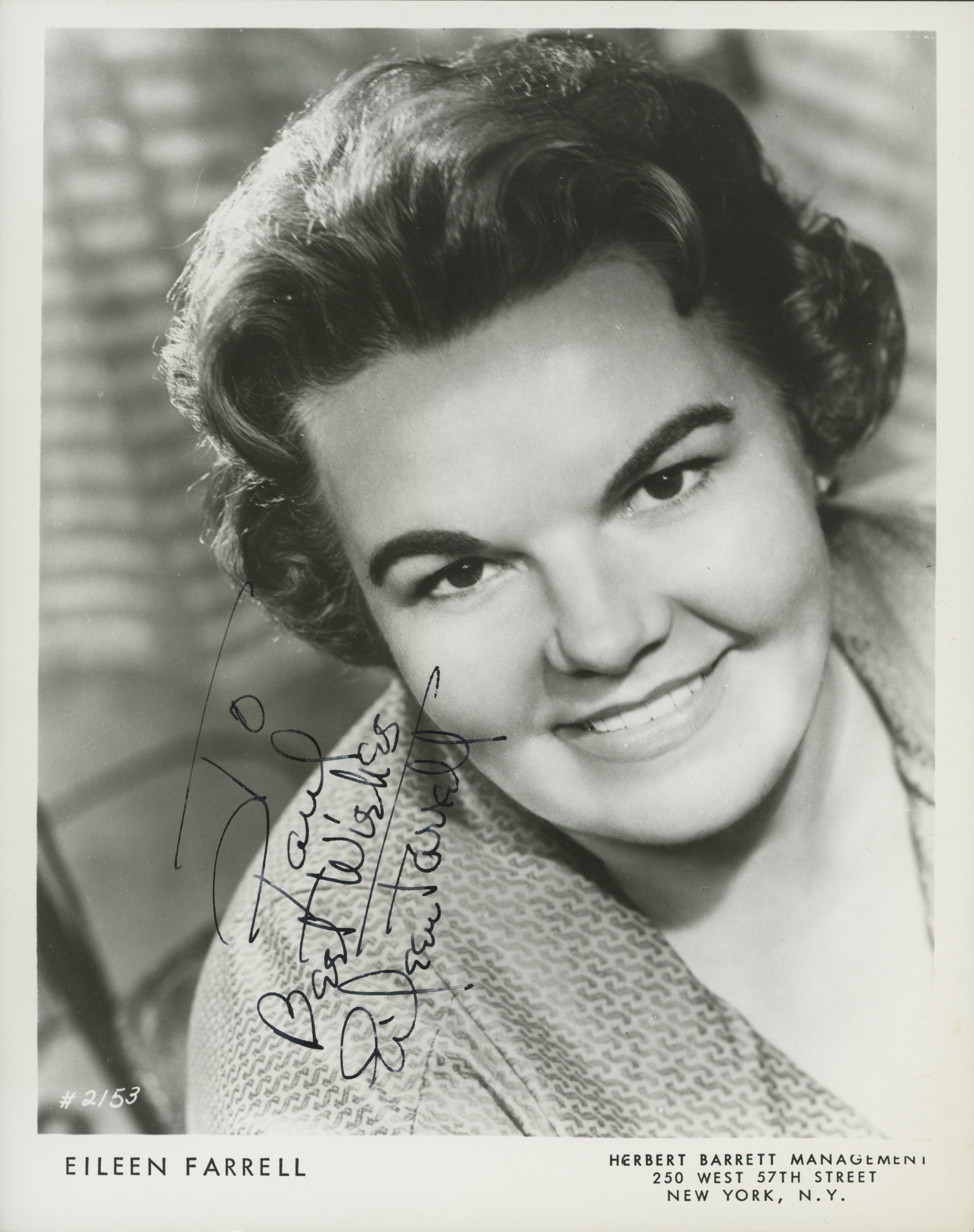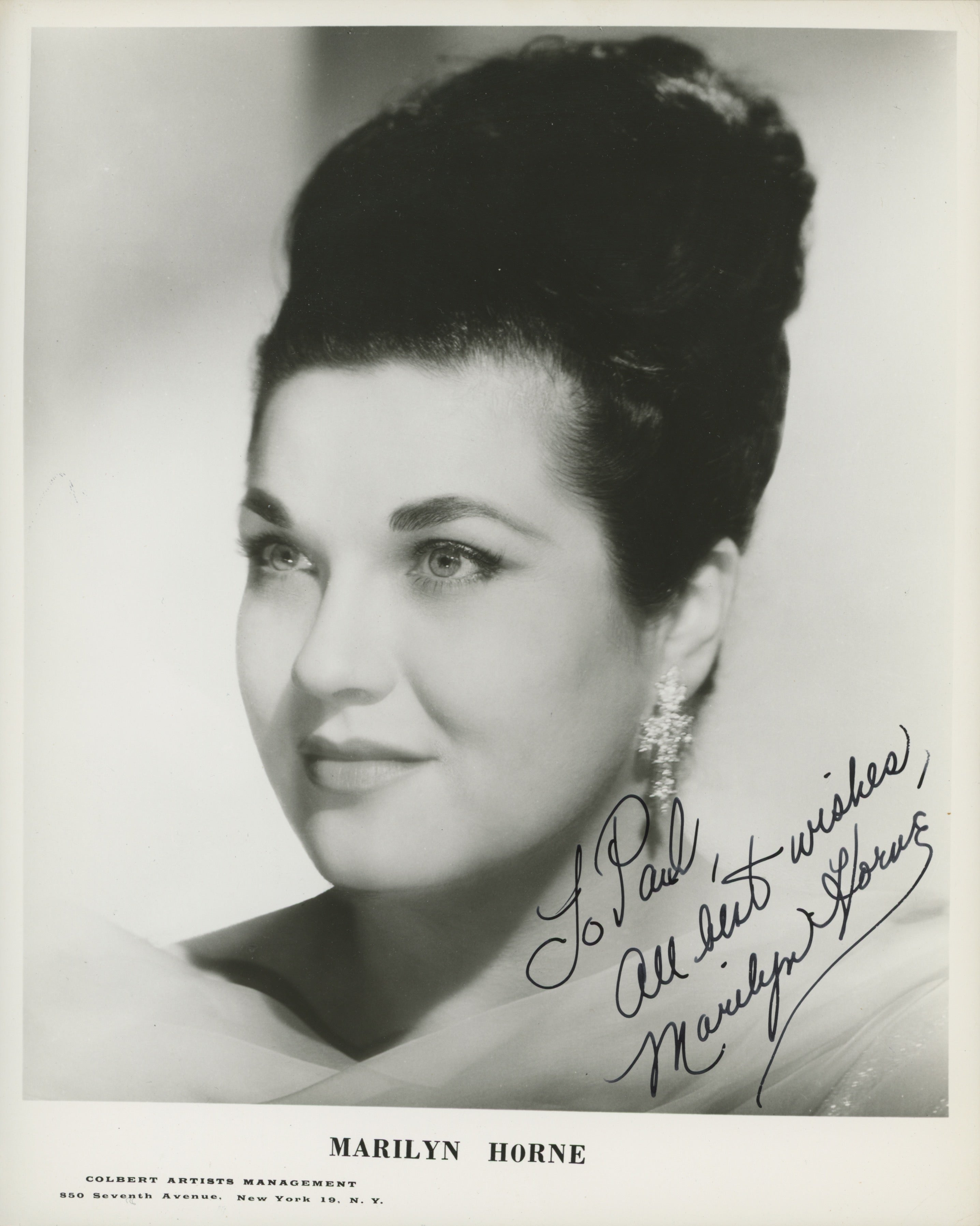 Collection of eleven signed photographs of female opera stars of the mid-to-late 20th century, including Eileen Farrell, Janice Hall, Cynthia Haymon, Marilyn Horne, Laurel Hurley, Helen Vanni, Frederica von Stade, Sandra Warfield, and Yoko Watanabe.  Overall in fine to very fine condition.  Majority of prints 8 x 10 inches (20.3 x 25.4 cm.).