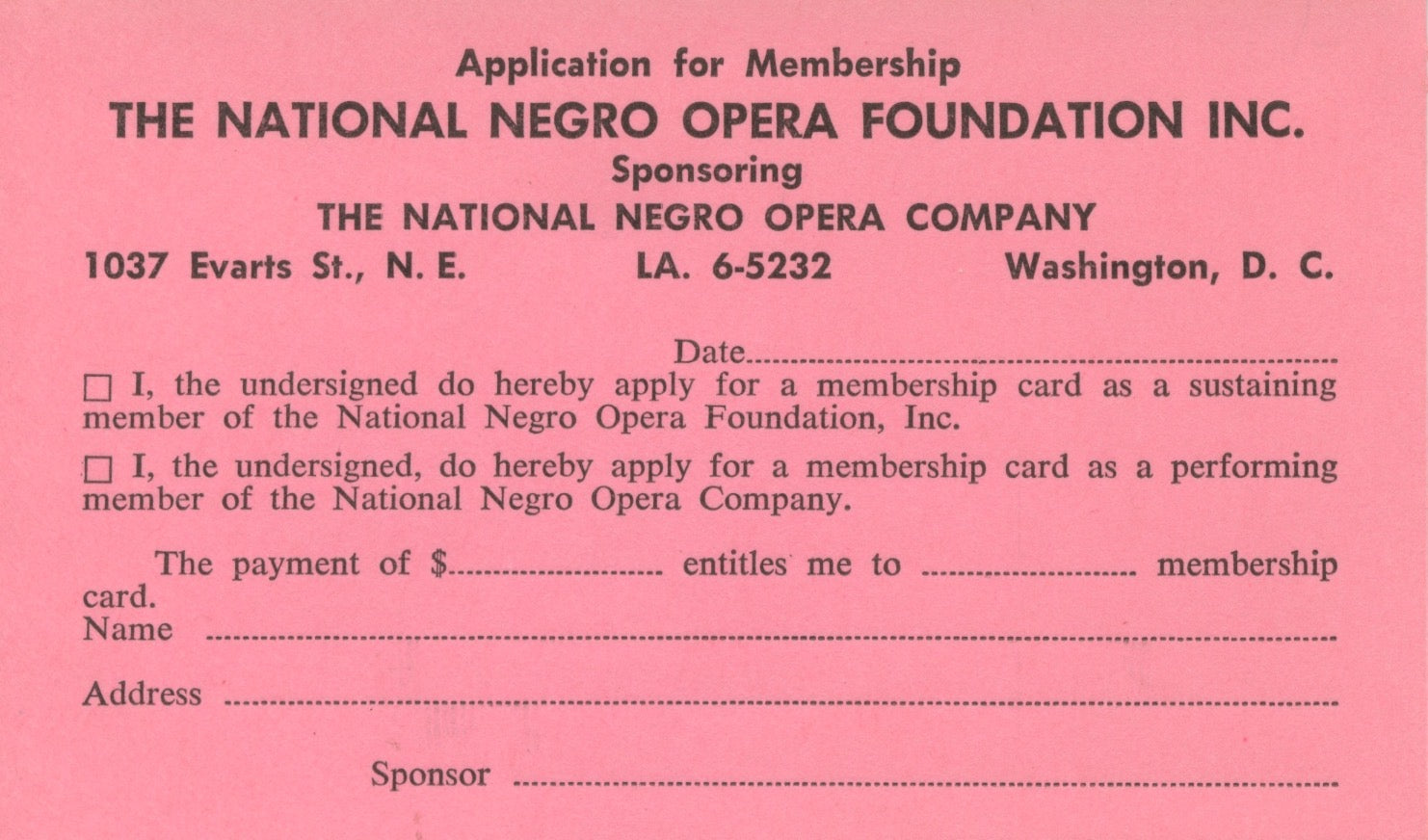 Pre-printed blank card for membership application to the National Negro Opera Foundation, Inc., "Sponsoring the National Negro Opera Company." Washington, D.C., no date. Pink paper. Oblong format, 3 x 5 inches (7.6 x 12.6 cm). In very fine condition. Uncommon.