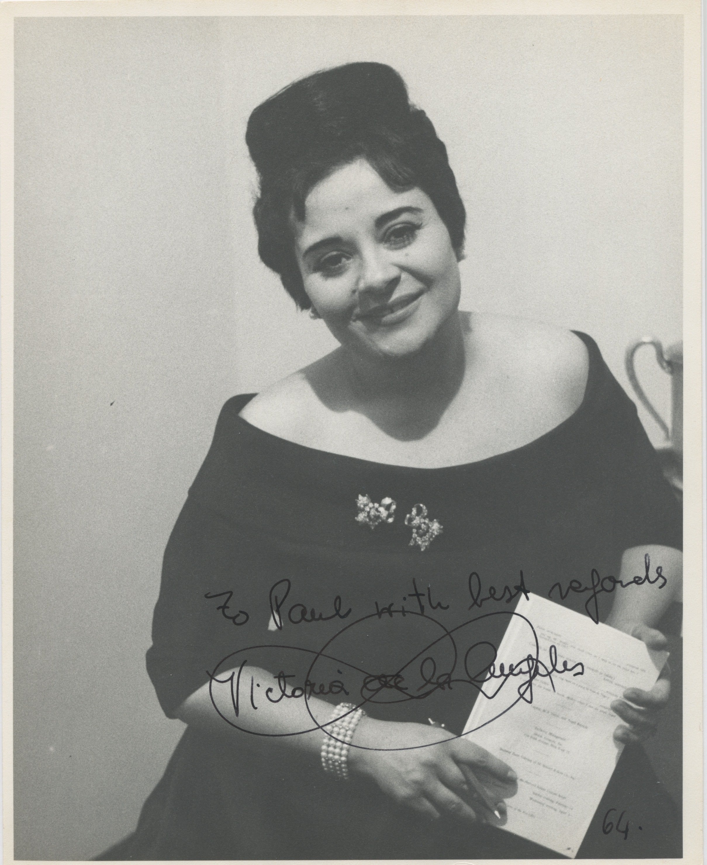 Signed doubleweight matte candid photograph of the Catalan soprano seated with a program and a pen in her hands. Inscribed to Paul McMahon. 10 x 8 inches (25.3 x 20.2 cm). In fine condition.
