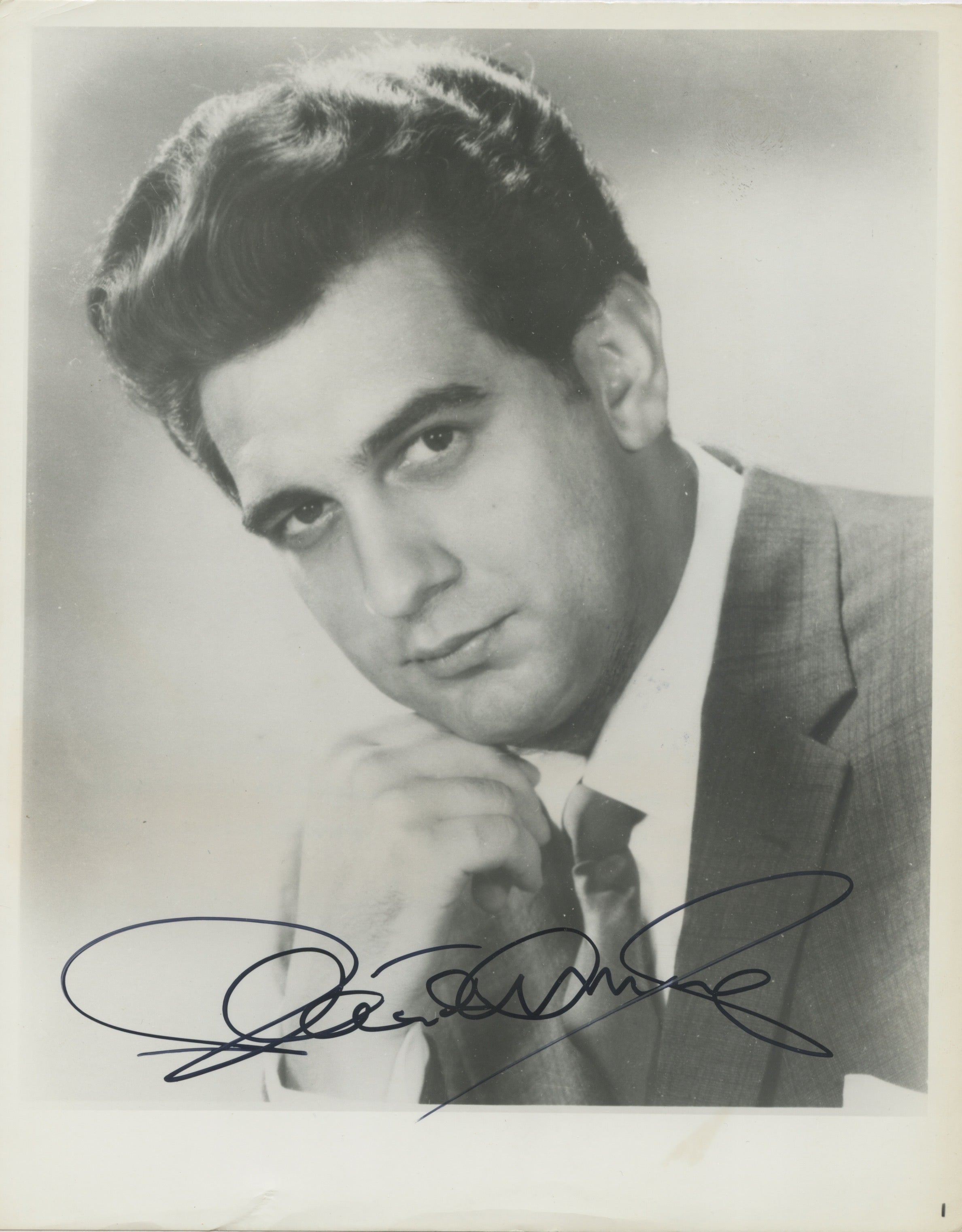 Signed promotional portrait (in formal attire) of the celebrated Spanish opera singer (formerly tenor, now baritone), conductor and arts administrator. Two typed labels mounted to verso, announcing Domingo's forthcoming appearance as Turiddu in the Met's guest performance of Mascagni's Cavalleria rusticana in Boston on "Friday, April 24" (no year, ca. 1970s). 10.25 x 8 inches (25.8 x 20.3 cm). Corners very lightly bumped, else fine.