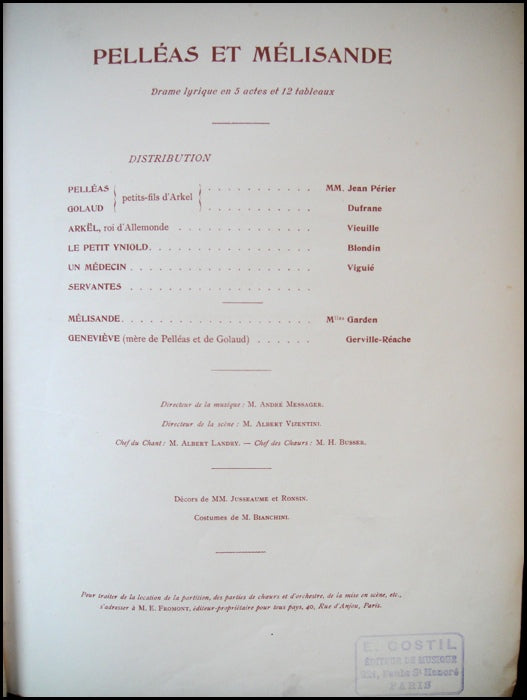 Debussy, Claude. (1862-1918) Pelléas et Mélisande. Drame lyrique en 5 actes et 12 tableaux de Maurice Maeterlinck [...]. Partition pour piano et chant.