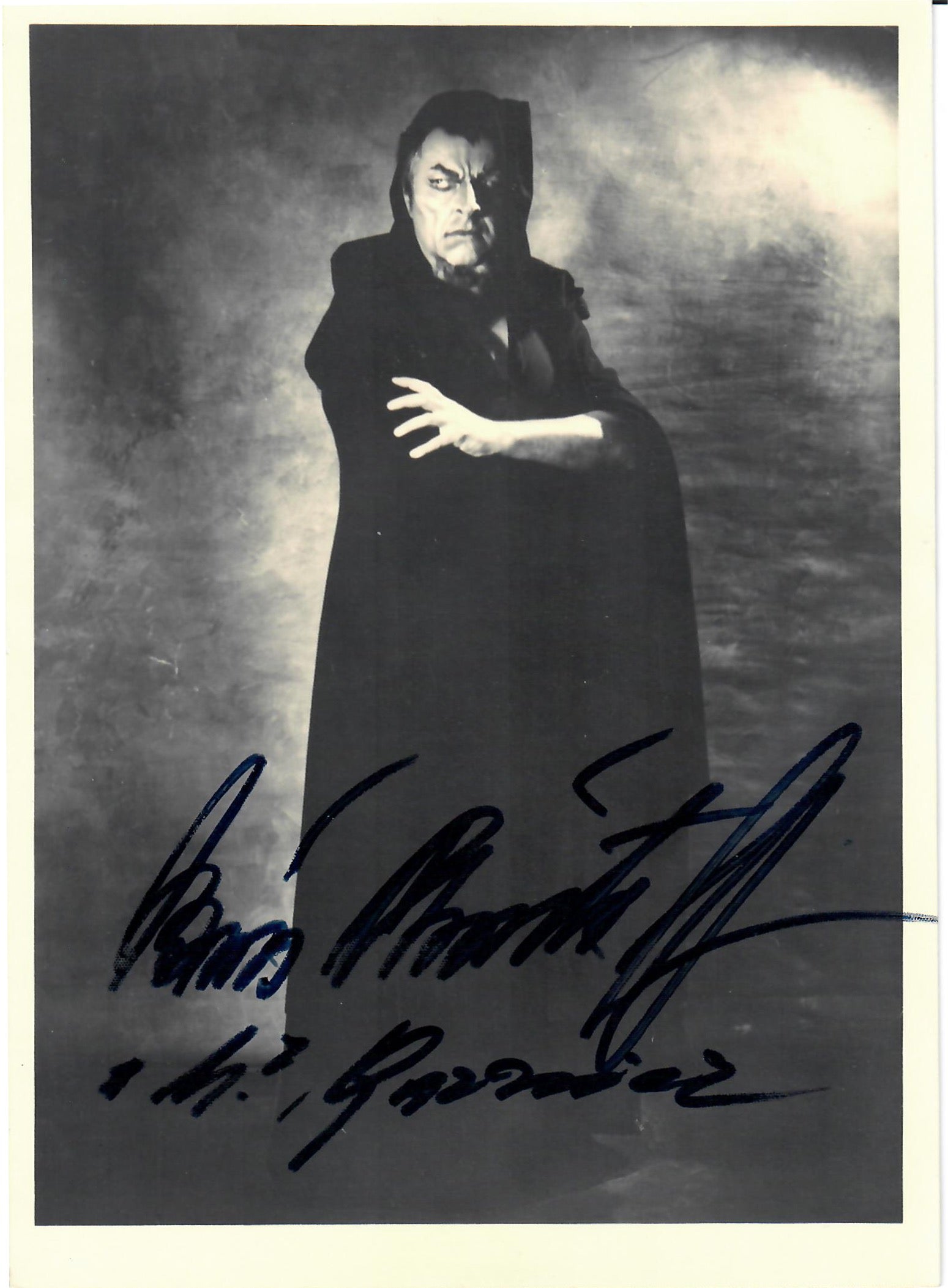 Signed full length photograph of the great Bulgarian basso in one of his most famous roles. 5.2 x 7.2 inches (13 x 18cm.). In very fine condition.