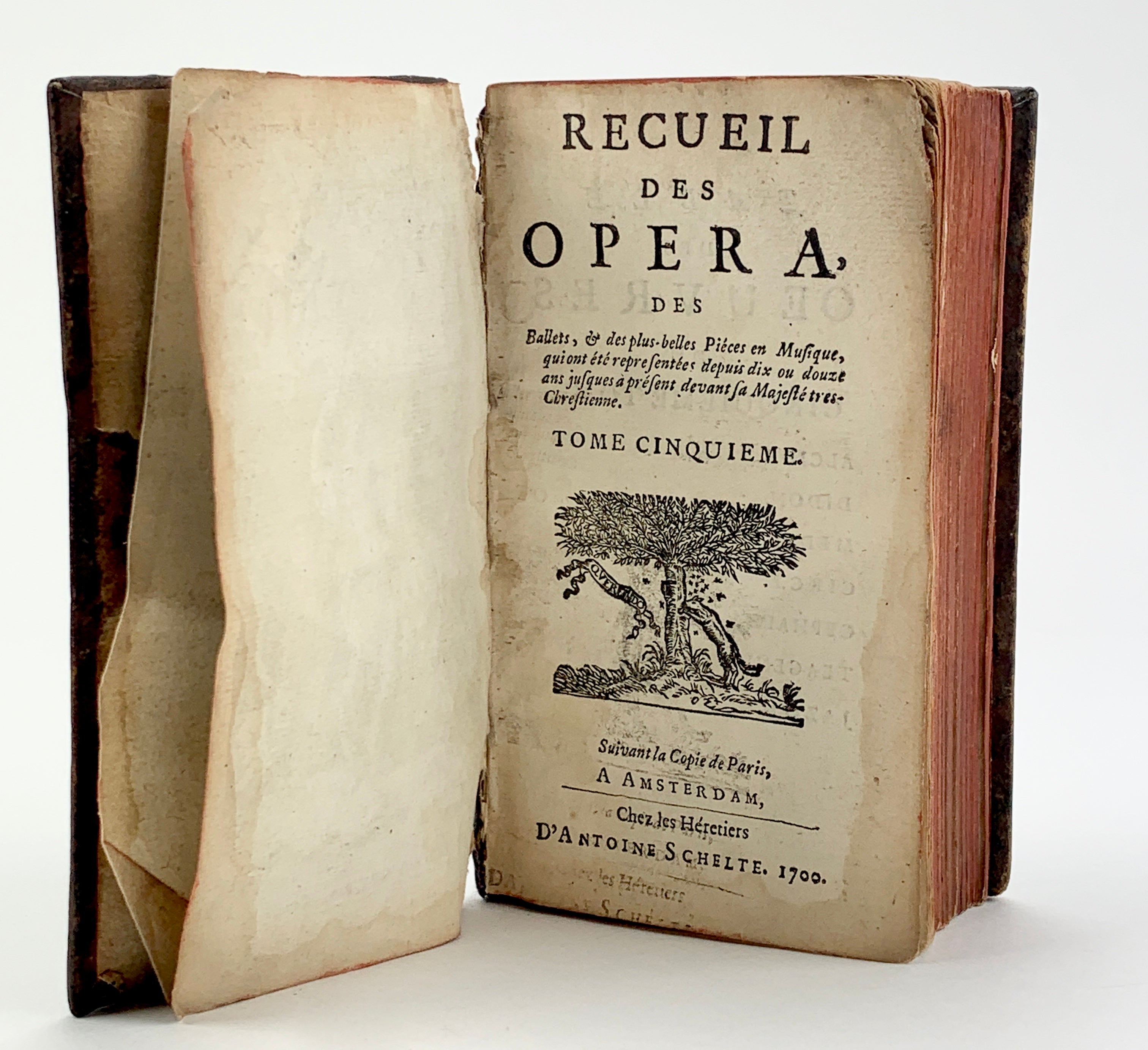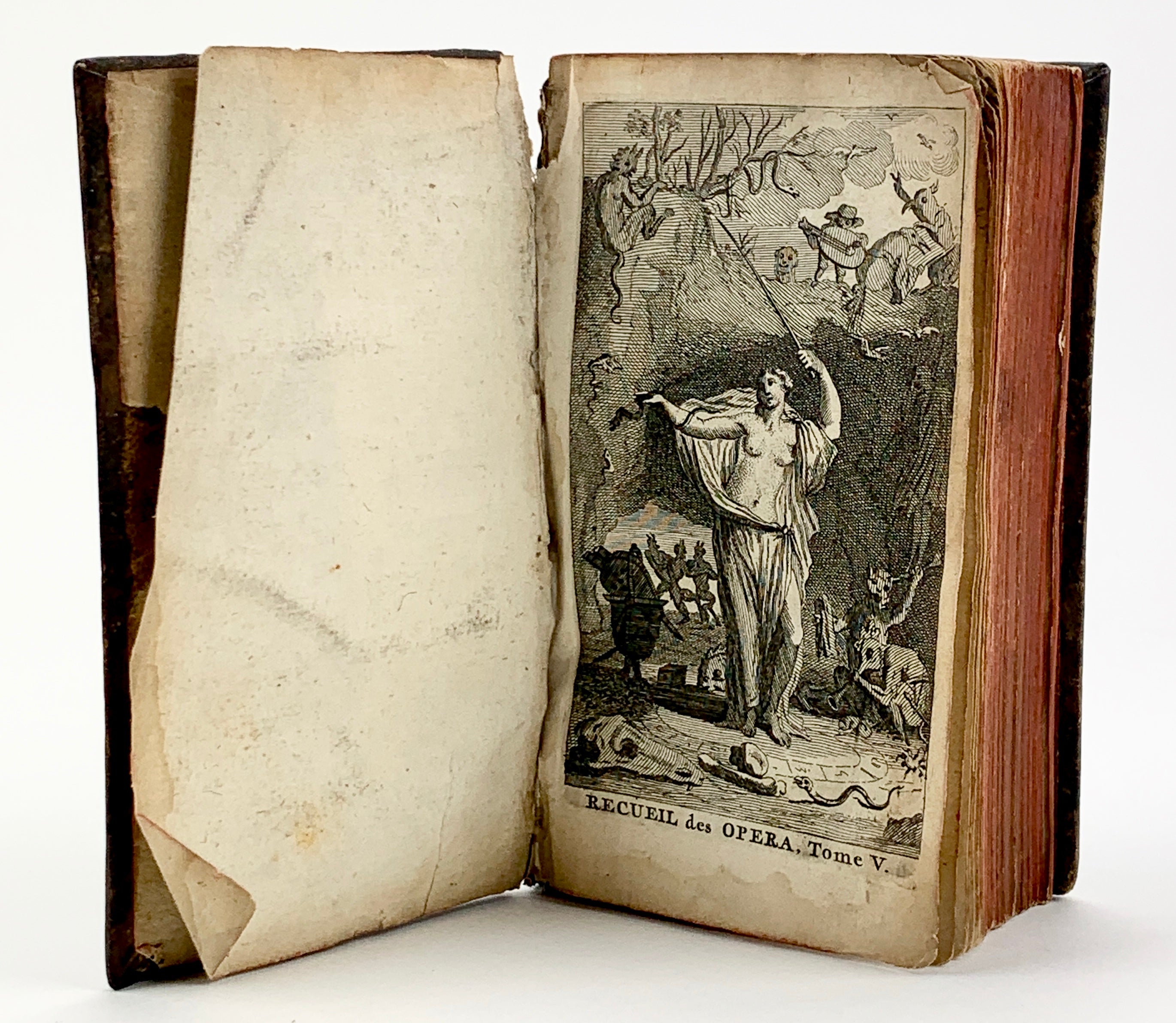 32mo. bound volume containing individually paginated libretti to Alcide (44pp), Didon (57pp), Medée (69pp), Circe (59pp), Cephale & Procris (56pp), Teagene & Cariclée (60 pp) and Jason (48pp), each with a finely engraved illustration preceding or opposite their respective title pages, the collection preceded by Title; Table des Oeuvres. Contemporary full leather boards with four raised bands to spine, boards bending and splitting along the gutters, else generally fine throughout.